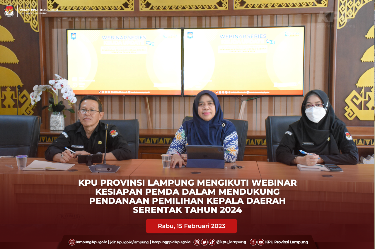 Bandar Lampung, Anggota KPU Provinsi Lampung, Titik Sutriningsih Bersama Kabag. Rendatin, Amrozie W dan Kasubbag. Perencanaan, Sri Merinda Kusumayuda mengikuti Webinar Kesiapan Pemda dalam Mendukung Pendanaan Pemilihan Kepala Daerah Serentak Tahun 2024 di Aula KPU Provinsi Lampung, Rabu (15/02). Kegiatan ini dilaksanakan dalam rangka menjamin kepastian tersedianya pendanaan Kegiatan Pemilihan Gubernur dan Wakil Gubernur, Bupati dan Wakil Bupati serta Walikota dan Wakil Walikota Serentak Tahun 2024 dalam APBD yang merupakan program strategis Nasional sesuai dengan amanat Undang-Undang. Kegiatan turut dihadiri oleh Kemendagri dan kementrian terkait, Gubernur, Bupati dan Walikota, Inspektur Daerah, Kepala Bappeda, Kepala Badan Keuangan, Kepala Badan Kesbangpol, Ketua KPU RI, Ketua Bawaslu RI, Seluruh Indonesia.