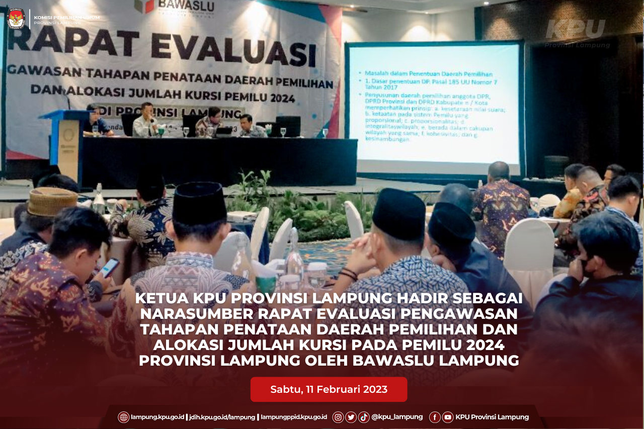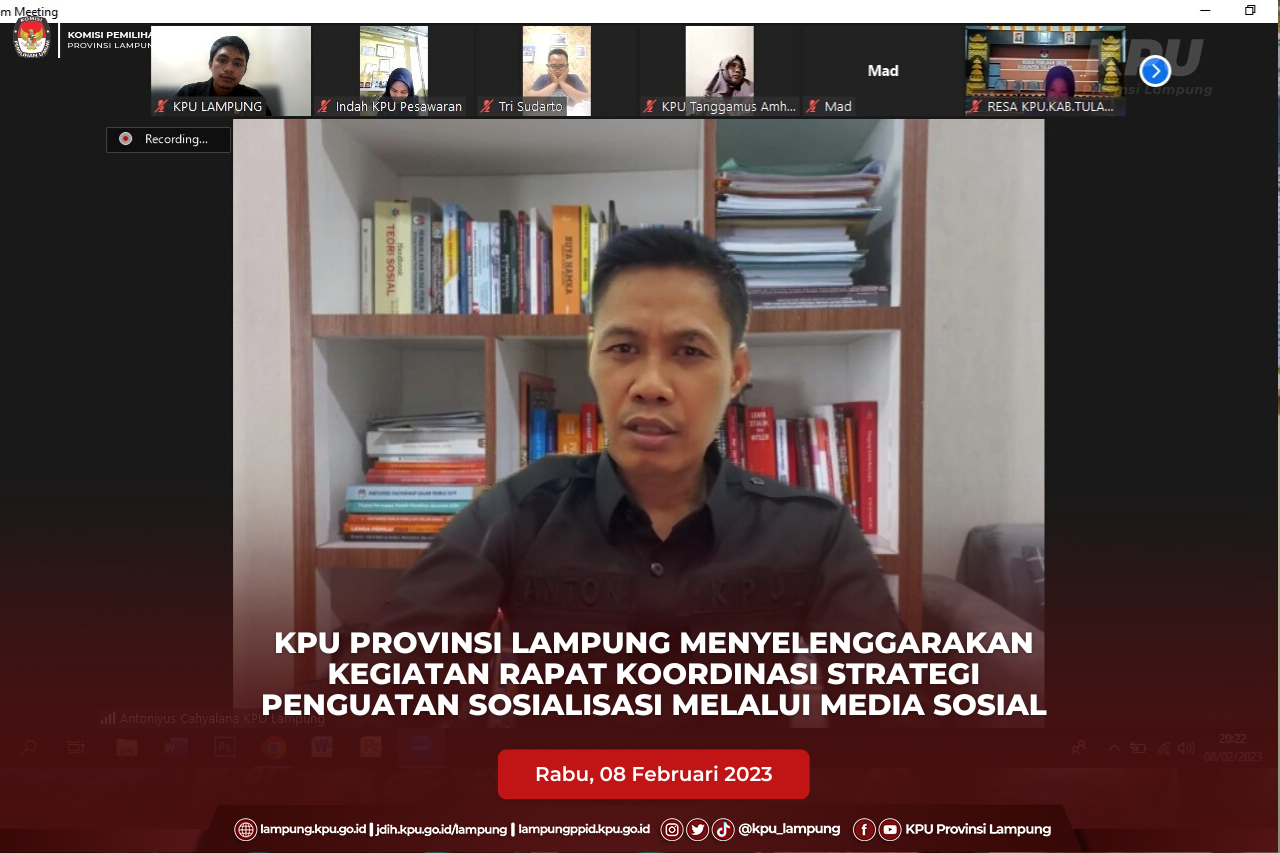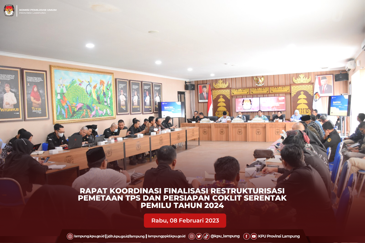 Bandar Lampung, KPU Provinsi Lampung melaksanakan Rapat Koordinasi Finalisasi Restrukturisasi Pemetaan TPS dan Persiapan Coklit Serentak Pemilu Tahun 2024, Rabu (08/02). Kegiatan dibuka oleh Ketua KPU Provinsi Lampung, Erwan Bustami didampingi oleh Anggota, Agus Riyanto, Ali Sidik, Warsito, Titik Sutriningsih dan Ismanto, Sekretaris, Mashur Sampurna Jaya. Dlanjutkan dengan pengarahan oleh Anggota dan Sekretaris KPU Provinsi Lampung dan Penyampaian Materi oleh Ketua Divisi Data dan Informasi (Datin), Agus Riyanto.