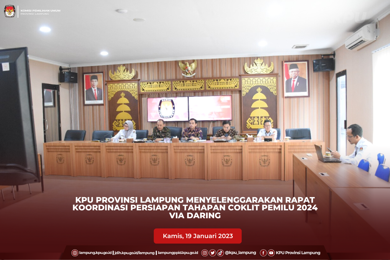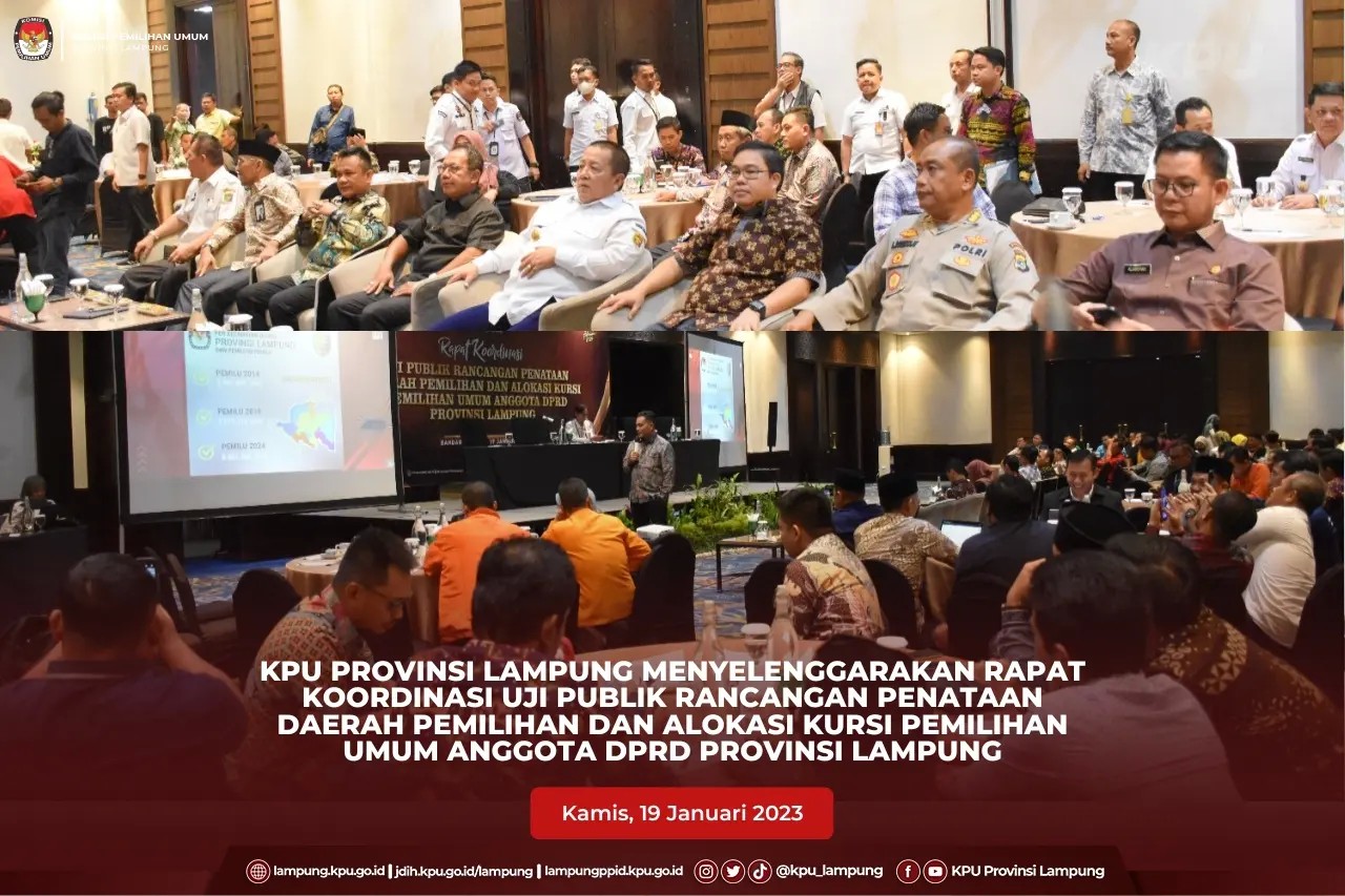 Bandar Lampung, KPU Provinsi Lampung menyelenggarakan Rapat Koordinasi Uji Publik Rancangan Penataan Daerah Pemilihan dan Alokasi Kursi Pemilihan Umum Anggota DPRD Provinsi Lampung, Kamis (19/01). Kegiatan dibuka oleh Ketua KPU Provinsi Lampung, Erwan Bustami dilanjutkan dengan arahan oleh Gubernur Lampung, Arinal Djunaidi dan Pemaparan materi uji publik oleh Anggota KPU Provinsi Lampung, Ismanto. Kegiatan diikuti oleh Gubernur Lampung, Ketua DPRD Provinsi Lampung, Forkopimda, Ketua, Anggota dan Sekretaris KPU Provinsi Lampung, Ketua dan Anggota Bawaslu Provinsi Lampung, Instansi Vertikal, Organisasi Masyarakat, Organisasi Media, Tokoh Masyarakat, Akademisi, Partai Politik, Pematau Pemilu dan Stakeholder Terkait. Ketua KPU Provinsi Lampung Erwan Bustami menyampaikan bahwa Uji Publik dilakukan setelah keluarnya surat KPU RI bernomor 51/PL.01.3-SD/05/2023 pada 13 Januari 2023, tentang Pelaksanaan Uji Publik Rancangan Dapil DPRD Provinsi. Surat tersebut menidaklanjuti putusan Mahkamah Konstitutsi (MK) No. 80/PUU-XX/2022, yang memberikan kewenangan terhadap KPU (RI) untuk mengatur dapil anggoa DPR (RI) dan DPRD Provinsi. Penataan Dapil dilaksankan dengan mengacu pada pasal 188 ayat (2)UU no 7 tahun 2017 dan Daftar Agregat Kependudukan (DAK) Semester I tahun 2022 yang telah diserahkan kepada KPU dimana jumlah jumlah penduduk Provinsi Lampung 8.901.566. Perubahan jumlah penduduk ini memyebabkan berkurangnya jumlah alokasi kursi DPRD Provinsi Lampung yang semula 85 Kursi menajdi 75 Kursi. Hal ini berdasarkan pasal 188 ayat (2) UU No 7 tahun 2017 tentang Pemilu, untuk jumlah penduduk 7-9 juta maka alokasi kursi DPRD Provinsi mencapai 75 kursi, sedangkan jika jumlah penduduk 9--11 juta maka alokasi kursi mencapai 85 kursi. Erwan menyampaikan bahwa Uji Publik dilaksankan untuk menampung saran dan masukan dari pemangku kepentingan . Hasil dari uji publik nantinya akan langsung dikirimkan kepada KPU RI. . #KPUMelayani #KPULampung #PemiluSerentak