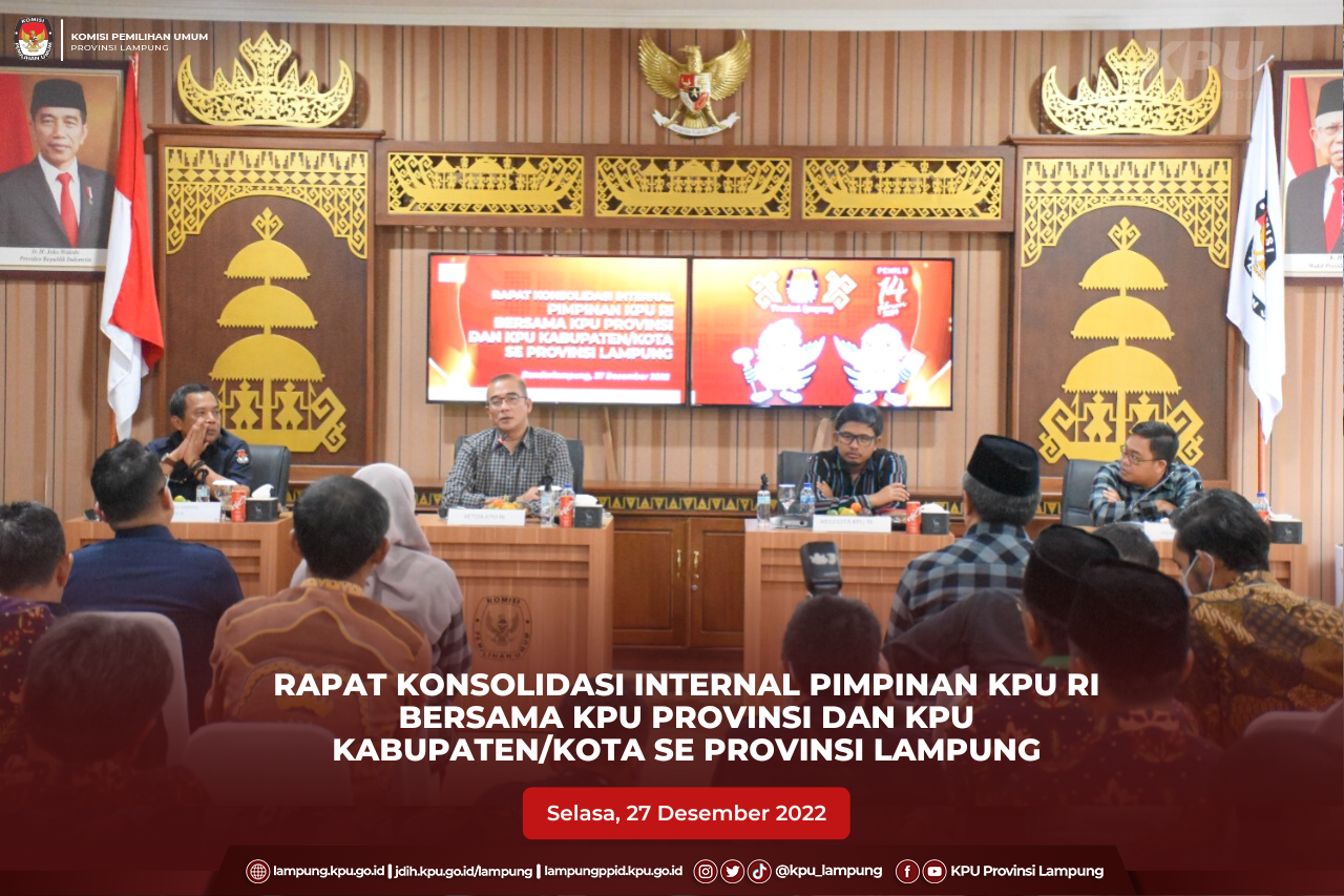 Bandar Lampung, KPU Provinsi Lampung menyelenggarakan Rapat Konsolidasi Internal Pimpinan KPU RI bersama KPU Provinsi dan KPU Kabupaten/Kota se Provinsi Lampung, Selasa (28/12). Kegiatan konsolidasi internal ini dipandu oleh ketua KPU Provinsi Lampung, Erwan Bustami dan diisi arahan oleh Ketua KPU RI, Hasyim Asy'ari, Anggota KPU RI, Idham Holik, Sekretaris Jenderal KPU RI, Bernad Dermawan Sutrisno. Kegiatan diihadiri oleh Anggota KPU Provinsi Lampung, Antoniyus, Ismanto, Agus Riyanto, Ali Sidik, Warsito, Sekretaris Mashur Sampurna Jaya beserta Jajaran Para Kabag, Pejabat Fungsional, Para Kasubbag serta Ketua, Anggota dan Sekretaris KPU Kabupaten Kota Se-Provinsi Lampung.