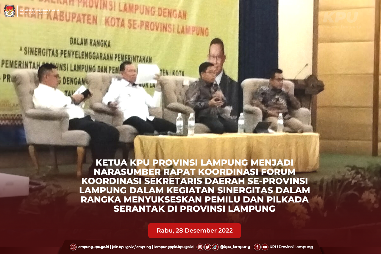 Bandar Lampung, KPU Provinsi Lampung menyelenggarakan kegiatan Malam Silaturahmi dan Konsolidasi Demokrasi Menuju Pemilu Serentak Tahun 2024, Selasa (28/12). Kegiatan dihadiri oleh Ketua KPU RI, Hasyim Asy'ari, Anggota KPU RI, Idham Holik, Sekretaris Jenderal KPU RI, Bernad Dermawan Sutrisno, Anggota DKPP RI, M Tio Aliasnyah, Gubernur Lampung, Arinal Djunaidi, Forkopimda Provinsi Lampung, Ketua, Anggota, Sekretaris KPU Provinsi Lampung beserta jajaran, Ketua/Kepala Instansi Vertikal dan Kepala Dinas terkait, Ketua Bawaslu Provinsi Lampung beserta jajaran dan Ketua Bawaslu Kabupaten/Kota, Rektor Perguruan Tinggi di Provinsi Lampung, Ketua Organisasi Kemasyarakatan, Ketua Organisasi Kepemudaan, Ketua Organisasi Mahasiswa, Ketua Organisasi Pers dan KPU Kabupaten/Kota Se Provinsi Lampung.