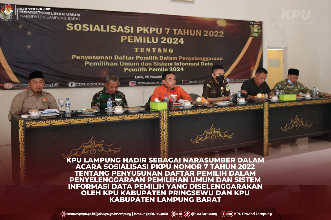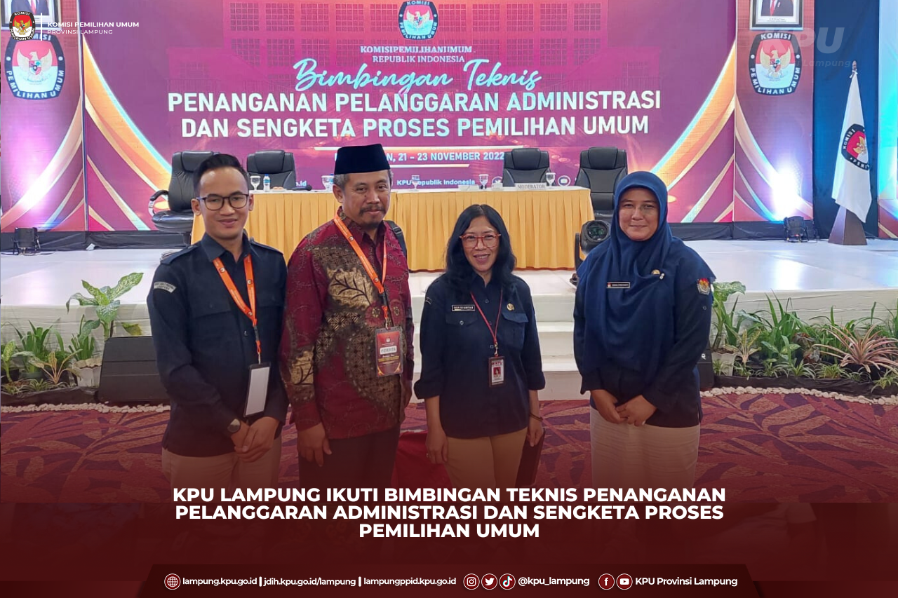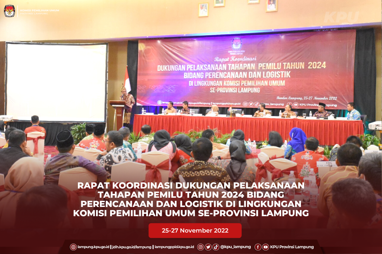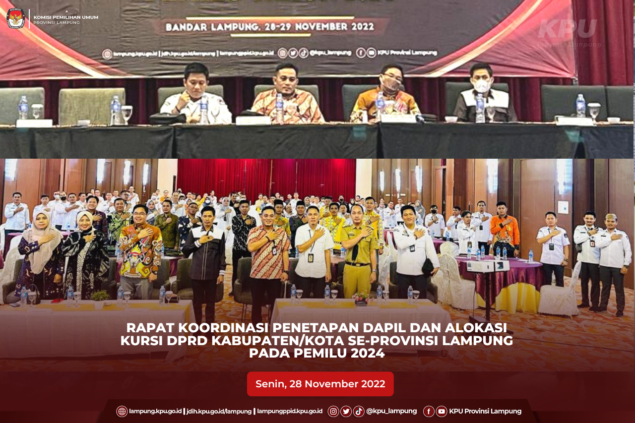 Bandar Lampung, KPU Provinsi Lampung menyelenggarakan kegiatan Rapat Koordinasi penetapan dapil dan alokasi kursi DPRD Kabupaten/Kota Se-Provinsi Lampung pada pemilu 2024, 28-29 November 2022. Senin (28/11) Kegiatan rapat ini di oleh Ketua KPU Provinsi Lampung,Erwan Bustami yang di dampingi oleh anggota KPU Provinsi Lampung , Titik Sutriningsih, Ismanto, Antoniyus dan Sekretaris KPU Provinsi Lampung Mashur Sampurna Jaya. Dalam sambutannya Ketua KPU Provinsi Lampung Erwan Bustami menyampaikan bahwa dalam proses penetapan dari ini benar-benar harus menerapkan prinsip-prinsip yang sudah di tetapkan yang salah satu nya ialah proporsional sehingga pada saatnya kelak dapil yang telah di tetapkan dapat sesuai dengan masing-masing daerah. Kegiatan menghadirkan dua narasumber yaitu, Ari darmastuti (Akademisi UNILA) dan Hermansyah (Anggota Bawaslu Provinsi Lampung). Adapun Peserta pada kegiatan ini meliputi anggota KPU kabupaten/Kota Divisi Teknis penyelenggaraan pemilu dan Divisi Data dan Informasi, Kasubag Teknis dan operator Sidapil juga mengundang Kesbangpol dan Ketua Bawaslu provinsi dan Kabupaten/Kota. #KPUMelayani #KPULampung #pemiluserentak2024