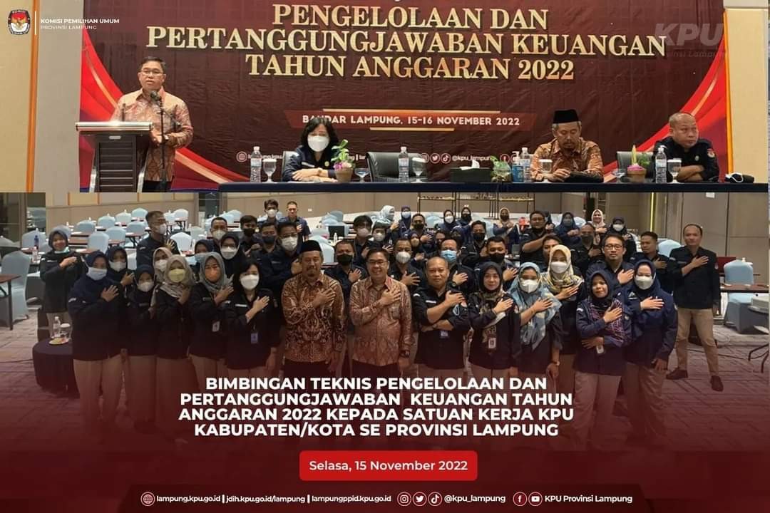 Bandar Lampung, KPU Provinsi Lampung melaksanakan kegiatan Bimbingan Teknis Pengelolaan dan Pertanggungjawaban Keuangan Tahun Anggaran 2022 Kepada Satuan Kerja KPU Kabupaten/Kota se Provinsi Lampung, Selasa (15/11). Kegiatan yang berlangsung selama dua hari Selasa dan Rabu, 15-16 November 2022 ini dibuka oleh Ketua KPU Provinsi Lampung, Erwan Bustami didampingi oleh Anggota Titik Sutriningsih dan Warsito. Kegiatan diikuti oleh peserta dari KPU Provinsi Lampung dan peserta dari KPU Kabupaten Kota yaitu Pejabat Pembuat Komitmen (PPK), Bendahara dan staf pengelola keuangan serta moderator oleh Kabag KUL dan Kasubbag Keuangan Provinsi Lampung. Hadir sebagai Narasumber dari KPPN Bandar Lampung dengan dua materi yaitu Refreshment Aplikasi SAKTI Modul Komitmen dan Refreshment Aplikasi SAKTI Modul Bendahara, dari subbag Akuntansi dan Pelaporan KPU RI dengan materi penyampaian sosialisasi PIPK dan dari KPP Pratama I, Bandar Lampung dengan materi Kewajiban Perpajakan dalam Pengelolaan Keuangan pada Instansi Pemerintah. Dalam kegiatan juga diisi dengan Diskusi Bersama PPK dan Pengelolaan Keuangan yang dibuka oleh Seretaris KPU Provinsi Lampung, Mashur Sampurna Jaya. #KPUMelayani #KPULampung #PemiluSerentak2024