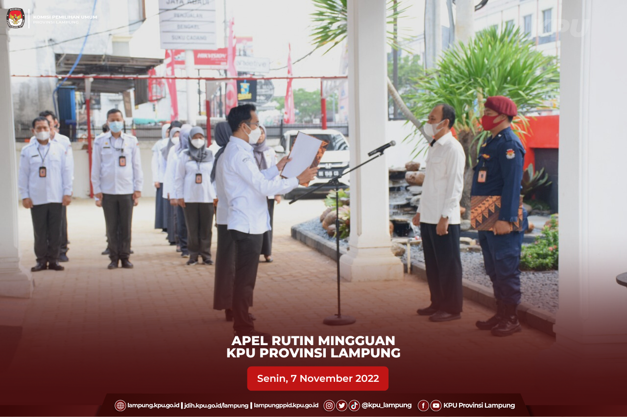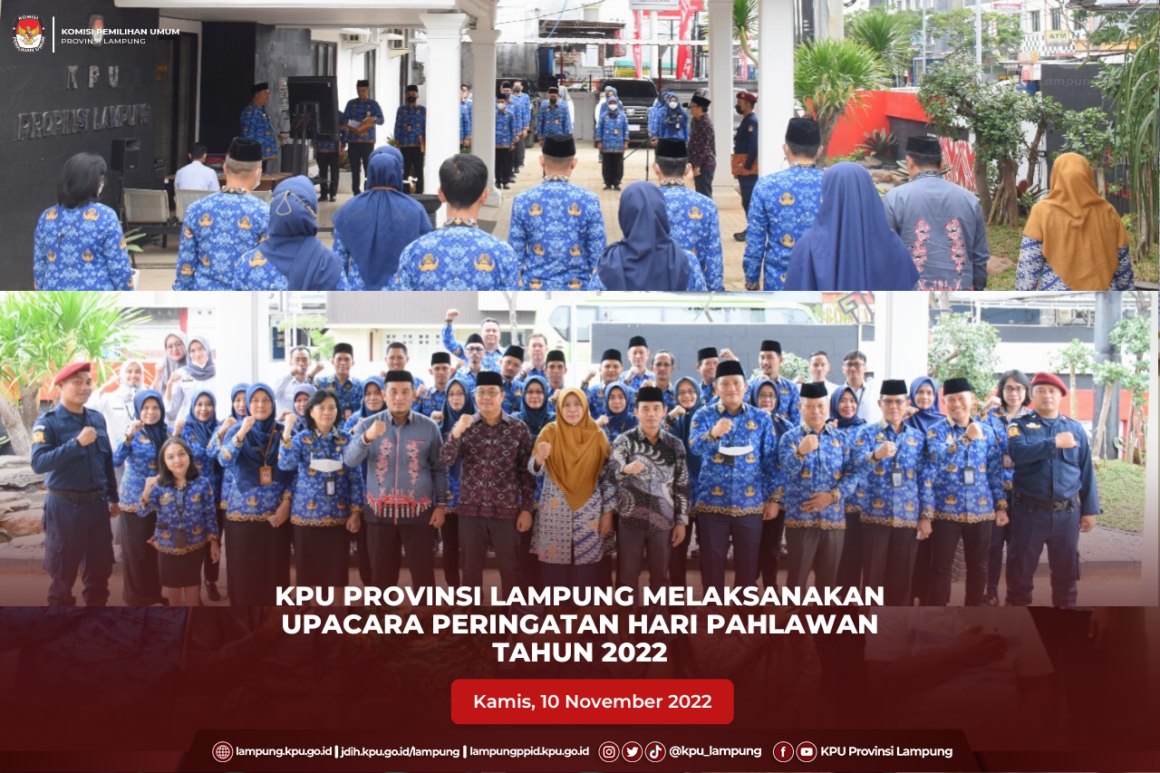 Bandar Lampung, KPU Provinsi Lampung melaksanakan Upacara Peringatan Hari Pahlawan Tahun 2022 dengan Tema “Pahlawanku Teladanku” di Halaman Kantor KPU Provinsi Lampung, Kamis (10/11). Kegiatan diikuti oleh Anggota KPU Provinsi Lampung, Ismanto, Titik Sutriningsih, Agus Riyanto, Sekretaris, Mashur Sampurna Jaya, Para Kabag, Pejabat Fungsional, Para Kasubbag, staf pelaksana dan PPNPN di lingkungan KPU Provinsi Lampung. Bertindak sebagai inspektur Upacara Ketua KPU Provinsi Lampung, Erwan Bustami yang juga membacakan sambutan dari Mentri Sosial Republik Indonesia, Tri Rismaharini. Erwan menyampaikan bahwa Peringatan Hari Pahlawan dilaksanakan setiap tahunnya dengan renungan yang sungguh sungguh untuk menemukan kembali jejak para Pahlawan dalam kehidupan sebagai Bangsa dan Negara Merdeka. Menghidupkan kembali perjuangan para Pahlawan Bangsa, serta meresapi semangat dan keihlasan dari para Pejuang yang gugur dalam palagan pertempuran mempertahankan Kemerdekaan. Ia mengajak peserta upacara untuk menjadikan momentum Peringatan Hari Pahlawan 2022 untuk memperkuat persatuan dan kesatuan bangsa, saling menghargai satu sama lain. “Jadikanlah semangat dan nilai–nilai Kepahlawanan sebagai inspirasi dalam setiap langkah hidup dan kehidupan kita Bersama”ungkapnya saat membacakan sambutan Mentri Sosial Republik Indonesia. #KPUMelayani #KPULampung #PemiluSerentak2024