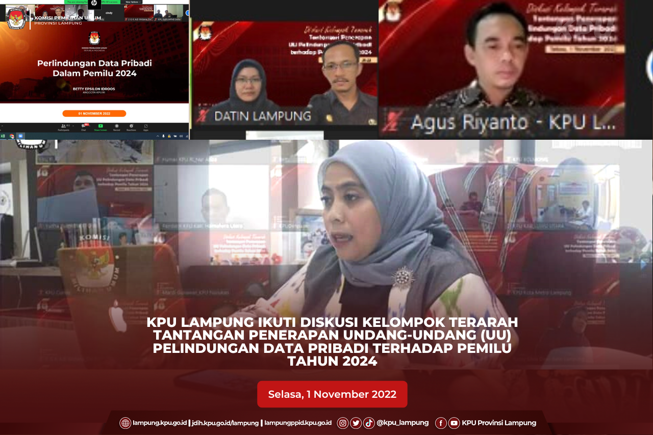Bandar Lampung, Ketua Divisi Data dan Informasi KPU Provinsi Lampung, Agus Riyanto Bersama dengan Tim Data dan Informasi mengikuti kegiatan Diskusi Kelompok Terarah Tantangan Penerapan Undang-Undang (UU) Pelindungan Data Pribadi terhadap Pemilu Tahun 2024. Kegiatan yang digelar Pusat Data dan Informasi (Pusdatin) Setjen KPU secara daring dibuka oleh Anggota KPU Betty Epsilon Idroos, Selasa (01/11/2022).
