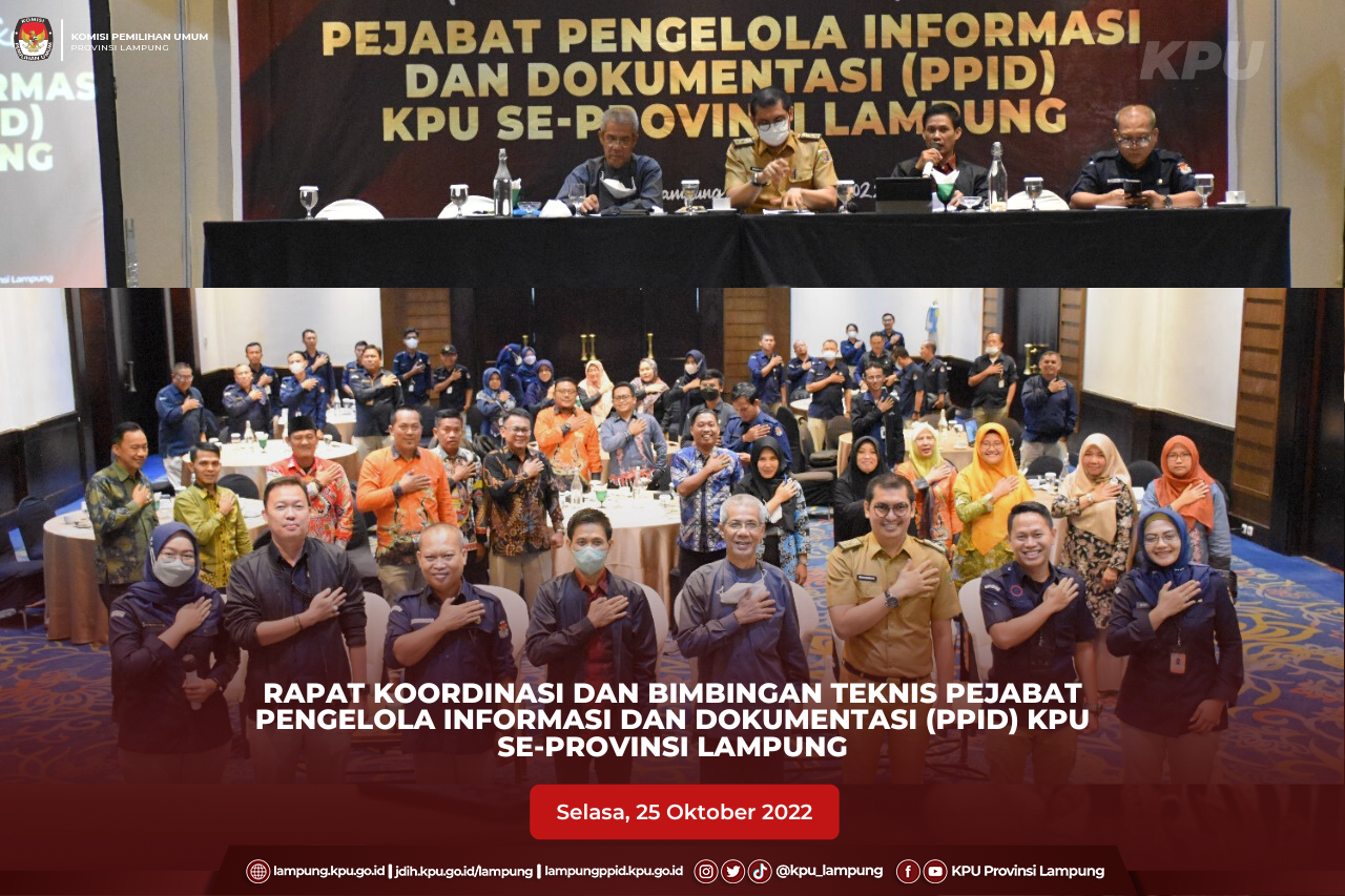 Bandar Lampung, KPU Provinsi Lampung melaksanakan Rapat Koordinasi dan Bimbingan Teknis Pejabat Pengelola Informasi dan Dokumentasi (PPID) KPU Se-Provinsi Lampung, Selasa (25/10). Kegiatan yang dibuka oleh Ketua Divisi Teknis Penyelenggaraan KPU Provinsi Lampung, Ismanto ini diikuti oleh Ketua Divisi Sosdiklih Parmas KPU Kabupaten/Kota Se Provinsi Lampung, Kasubbag Teknis dan Parmas dan operator PPID. Kegiatan menghadirkan tiga narasumber yaitu Anggota Komisi Informasi Provinsi Lampung, Ahmad Alwi Siregar dengan materi Transparansi kpu dalam pelayanan informasi publik, Kabid Pengelolaan dan Layanan Informasi Publik Dinas Komunikasi, Informatika dan Statistik Provinsi Lampung, Irsan Murhan dengan materi Peran PPID dalam Pemilu 2024, Kepala Bagian Humas dan Informasi Publik Sekretariat Jenderal KPU RI, Robby Leo Agust secara daring dengan materi Pengelolaan dan Pelayanan Informasi Publik Pemilu dan Pemilihan serta bimbingan teknis terkait pengelolaan website PPID yang disampaikan oleh Operator PPID KPU RI, Satrio Mahadi. Dalam arahannya Ketua Divisi Sosialisasi, Pendidikan Pemilih dan Partisipasi Masyarakat KPU Provinsi Lampung, Antoniyus menyampaikan bahwa salah satau ciri sebagai negara demokrasi adalah keterbukaan informasi, karena informasi menjadi kebutuhkan pokok masyarakat yang wajib dihormati, dilindungi dan dipenuhi. Oleh karena itu KPU menghadirkan e-PPID KPU untuk memudahkan masyarakat memperoleh informasi dan pengawasan penyelenggaraan Pemilu dan Pemilihan. Lebih lanjut ia menyampaikan bahwa semakin terbukanya informasi maka akan meningkatkan partisipasi masyarakat dalam Pemilu dan Pemilihan. #KPUMelayani #KPULampung #PemiluSerentak2024