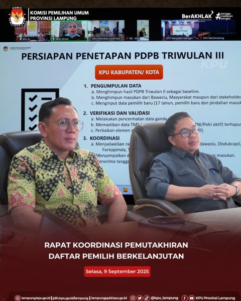 #TemanPemilih, Ketua KPU Provinsi Lampung, Erwan Bustami, Anggota Ervhan Jaya, bersama Kabag, Kasubbag Data dan infomasi dan Operator Sidalih mengikuti Rapat Koordinasi Pemutakhiran Data Pemilih Berkelanjutan secara daring bersama 38 KPU Provinsi dan 514 KPU Kabupaten/Kota, Selasa (09/09). Kegiatan yang diselenggarakan oleh KPU RI dilaksanakan secara daring.