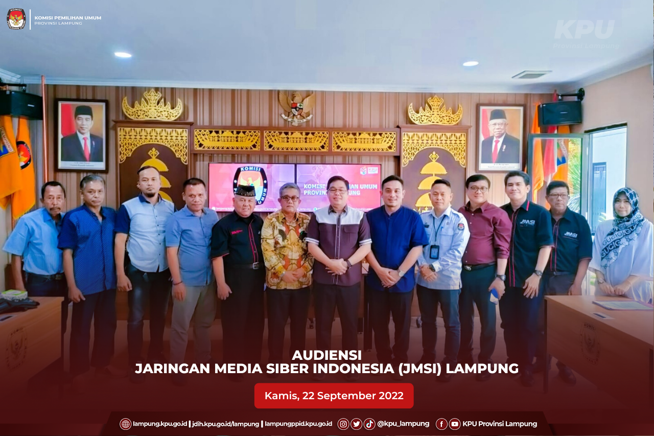 Bandar Lampung, KPU Provinsi Lampung (Ketua, Erwan Bustami bersama Anggota Antoniyus, Ismanto dan Kabag Teknis, Parmas dan Humas, Yustian Umri Sangon) menerima Audiensi Jaringan Media Siber Indonesia (JMSI) Lampung di Aula KPU Provinsi Lampung, Kamis (22/09). Kegiatan audiensi yang dilaksanakan dalam rangka koordinasi dan silaturahmi pengurus JMSI Lampung ini, juga bertujuan untuk membangun sinergisitas antara JMSI Lampung dan KPU Provinsi Lampung dalam rangka menyambut Pemilu 2024. Pada kesempatan tersebut Ketua JMSI Lampung, Ahmad Novriwan memperkenalkan struktur pengurus JMSI Lampung. selain itu ia juga menyampaikan terkait kolaborasi yang dapat dijalin antara JMSI dan KPU Provinsi Lampung terutama yang berkaitan pemberitaan, sosialisasi dan pendidikan pemilih Kepada masyarakat. Ketua KPU Provinsi Lampung, menyambut baik apa yang disapaikan oleh JMSI Lampung. Menurutnya kerjasama multipihak penting dilaksanakan guna menyukseskan Pemilu Serentak Tahun 2024. Ia juga menyampaikan bahwa media memiliki peran penting dalam Pemilu untuk mendorong kualitas demokrasi yang lebih baik. #KPUMelayani #KPULampung #PemiluSerentak2024