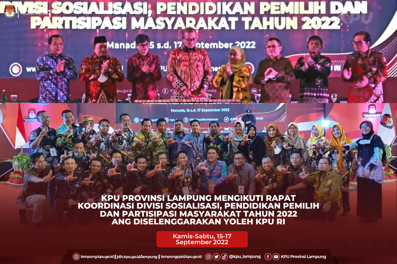 Bandar Lampung, Ketua Divisi Sosialisasi Pendidikan Pemilih dan Partisipasi Masyarakat KPU Provinsi Lampung, Antoniyus bersama dengan Kabag Teknis dan Parmas, Yustian Umri Sangon mengikuti Rapat Koordinasi Divisi Sosialisasi, Pendidikan Pemilih dan Partisipasi Masyarakat Tahun 2022 yang berlangsung di Manado, Kamis (15/09/2022). Kegiatan yang dibuka oleh Ketua KPU RI, Hasyim Asycl'ari ini diikuti lebih kurang 1.007 peserta dari KPU Provinsi/KIP Aceh dan KPU/KIP Kabupaten/Kota se-Indonesia. Turut hadir dan membuka kegiatan yang berlangsung tanggal 15−17 September 2022,Anggota KPU August Mellaz, Yulianto Sudrajat, Betty Epsilon Idroos, Mochammad Afifuddin, Parsadaan Harahap, dan Idham Holik bersama Sekretaris Jenderal KPU, Bernad Dermawan Sutrisno.