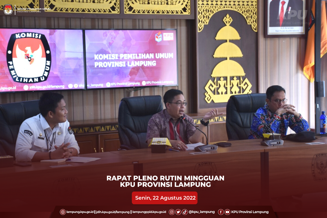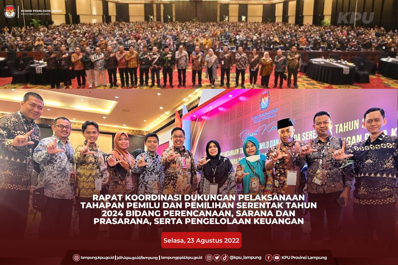 Bandar Lampung, Ketua KPU Provinsi Lampung, Erwan Butsami Bersama dengan Anggota, Titik Sutriningsih, Kabag Perencanaan Data dan Infromasi, Amrozie W dan Kabag Keuangan Umum dan Logistik, MM Reni Lestiani mengikuti Rapat Koordinasi Dukungan Pelaksanaan Tahapan Pemilu dan Pemilihan Serentak Tahun 2024 Bidang Perencanaan, Sarana dan Prasarana, Serta Pengelolaan Keuangan yang berlangsung di Nusa Dua Bali, Selasa (23/08/2022). Kegiatan yang berlangsung dari tanggal 23-25 Agustus 2022 ini dibuka oleh Ketua KPU RI, Hasyim Asy’ari dengan diikuti oleh lebih kurang 2.200 peserta KPU Provinsi/KIP Aceh dan KPU/KIP Kabupaten/Kota se-Indonesia. Membuka rakor, Hasyim meminta satuan kerja KPU berkonsentrasi penuh dalam membahas khususnya perencanaan keuangan. Hasyim juga mengingatkan agar KPU Provinsi sebagai pemimpin kepemiluan dapat mengendalikan KPU Kab/Kota untuk bekerja cermat, tertib, disiplin dan berdasar aturan. Sementara itu, Yulianto menyampaikan terkait anggaran KPU Tahun 2022, rincian kegiatan tahapan KPU Tahun 2022, komposisi anggaran tahun 2022 untuk satuan kerja KPU, KPU Provinsi, KPU Kab/Kota, tata kelola keuangan Pemilu, hingga pengelolaan dan data aset Barang Milik Negara (BMN) KPU. #KPUMelayani #PemiluSerentak2024 #KPULampung