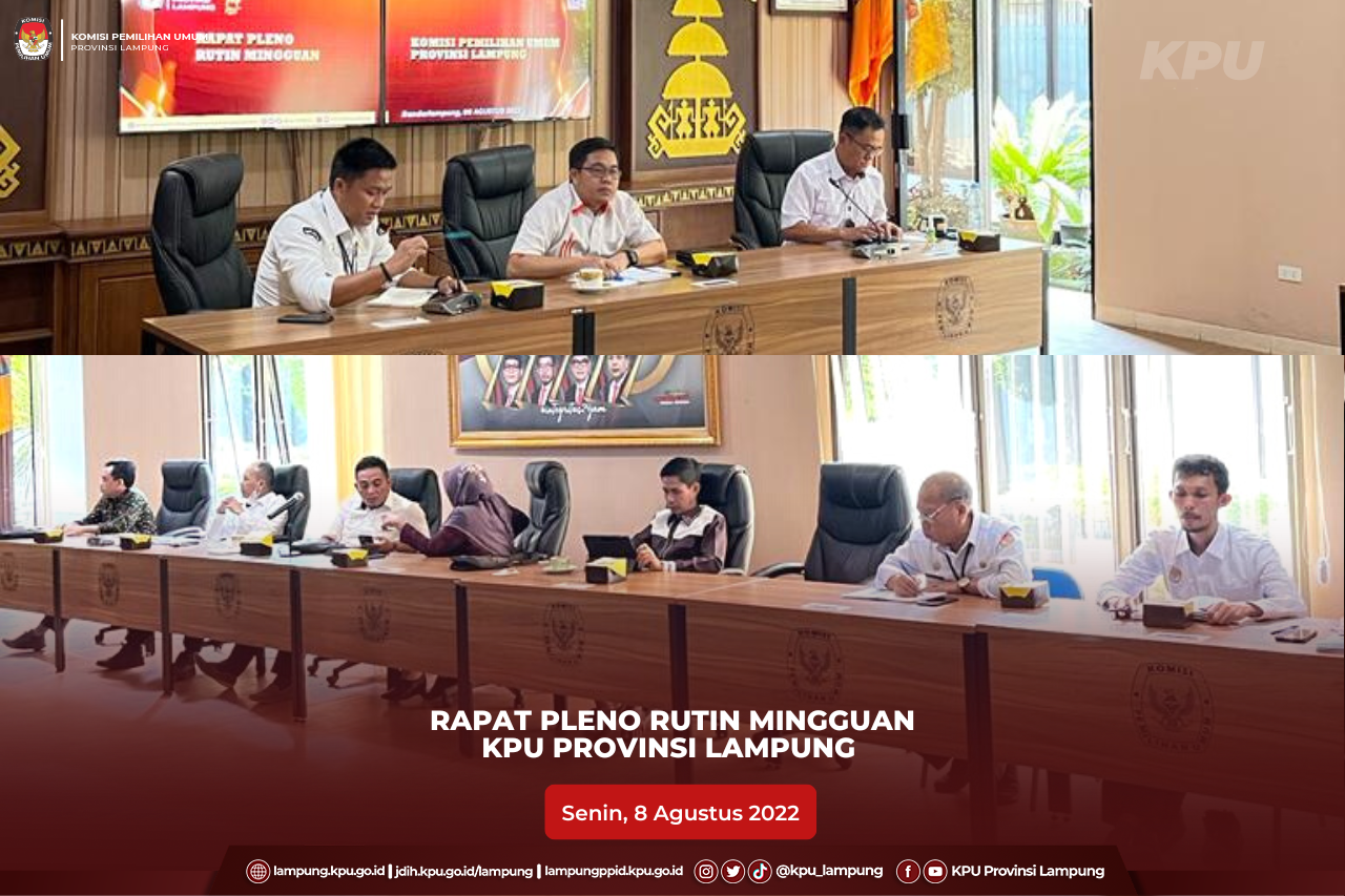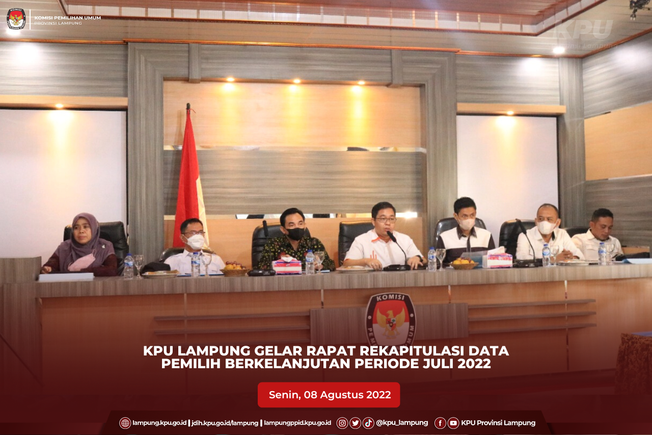 Press Releaae KPU Lampung Gelar Rapat Rekapitulasi Data Pemilih Berkelanjutan Periode Juli 2022 ________ KPU Provinsi Lampung gelar rapat rekapitulasi pemutakhiran data pemilih berkelanjutan periode Juli 2022 (08/07/2022) bersama 15 KPU Kabupaten/Kota melalui vertual bertempat di aula KPU Lampung Tengah. Hasil rekapitulasi data pemilih berkelanjutan periode Juli 2022 berjumlah 5.865.435 (lima juta delapan ratus enam puluh lima ribu empat ratus tiga puluh lima) terdiri dari pemiluh laki-laki sebanyak 2.994.659 pemilih dan pemilih perempuan sebanyak 2.870.776 pemilih. Adapun data DPB sebelumnya periode semester I (Januari - Juni) tahun 2022 berjumlah 5.873.741 pemilih (lima juta delapan ratus tujuh puluh tiga tujuh ratus empat puluh satu) dari 15 KPU Kabupaten/Kota, 229 Kecamatan dan 2.640 desa/kelurahan dengan jumlah TPS 19.727 TPS. Dengan perincian data yang berhasil dimutakhirkan di bulan Juli 2022 yaitu penambahan pemilih baru sebanyak 8.108 pemilih, sedangkan pemilih yang sudah tidak memenuhi syarat (TMS) sebanyak 16.414 pemilih, terdiri dari pemilih meninggal dunia sebanyak 406 pemilih, penghapusan data ganda sebanyak 11.381 pemilih, pindah keluar sebanyak 4.401 pemilih, tidak dikenal 198 pemilih, TNI 7, POLRI 20 dan bukan penduduk 1 pemilih. Kegiatan pemutakhiran data pemilih berkelanjutan dilakukan oleh KPU kabupaten/kota secara terus menerus dalam setiap bulannya dalam rangka memelihara dan memperbarui data pemilih agar lebih akurat, mutakhir dan berkualitas. Dengan pemutakhiran data pemilih secara berkelanjutan maka akan memudahkan proses pemutakhiran data pemilih pada saat tahapan pemilu/pemilihan. Berdasarkan Surat Edaran KPU RI nomor 613 tahun 2022, bahwa pelaksanaan Pemutakhiran Data Pemilih Berkelanjutan (PDPB) akan berakhir pada bulan September 2022 satu bulan menjelang penerimaan DP4 di bulan Oktober 2022 yang diserahkan oleh Kementerian Dalam Negeri kepada KPU RI. ______ Divisi Data dan Informasi KPU Provinsi Lampung