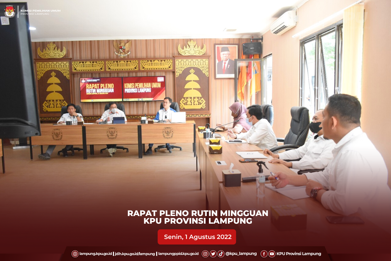 Dalam Rapat pleno dibahas mengenai pelaksanaan diskusi rutin mingguan mengenai Rapat Rekapitulasi PDPB Bulan Juli Tahun 2022 Tingkat Provinsi, kesiapan tim helpdesk KPU Provinsi Lampung serta pengecekan data di SIPOL, pembuatan Press Release oleh masing-masing subbgaian, persiapan kegiatan Rapat Koordinasi di Lampung Utara, pengembagan aplikasi gabungan terkait e-RPP dan e-PPID, percepatan pembentukan podcast KPU Provinsi Lampung serta peningkatan kapasitas SDM melalui Sertifikasi PBJ di KPU Kabupaten/Kota Se Provinsi Lampung.