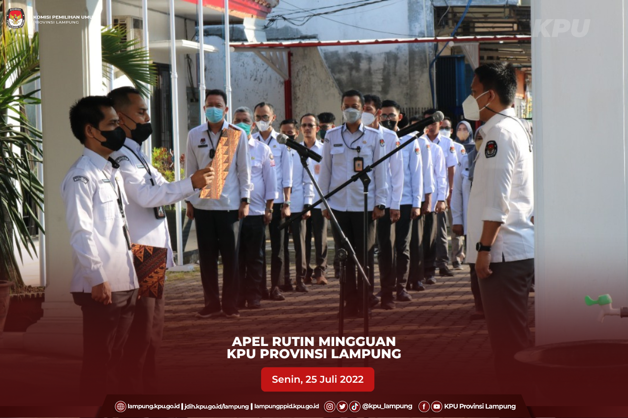 Bandar Lampung, KPU Provinsi Lampung menyelenggarakan Apel Rutin Mingguan, Senin (25/07). Kegiatan apel diikuti oleh Kabag dan Kasubbag beserta staf di Halaman Kantor KPU sertempat. Bertindak sebagai pembina apel Sekretaris KPU Provinsi Lampung, Mashur Sampurna Jaya.