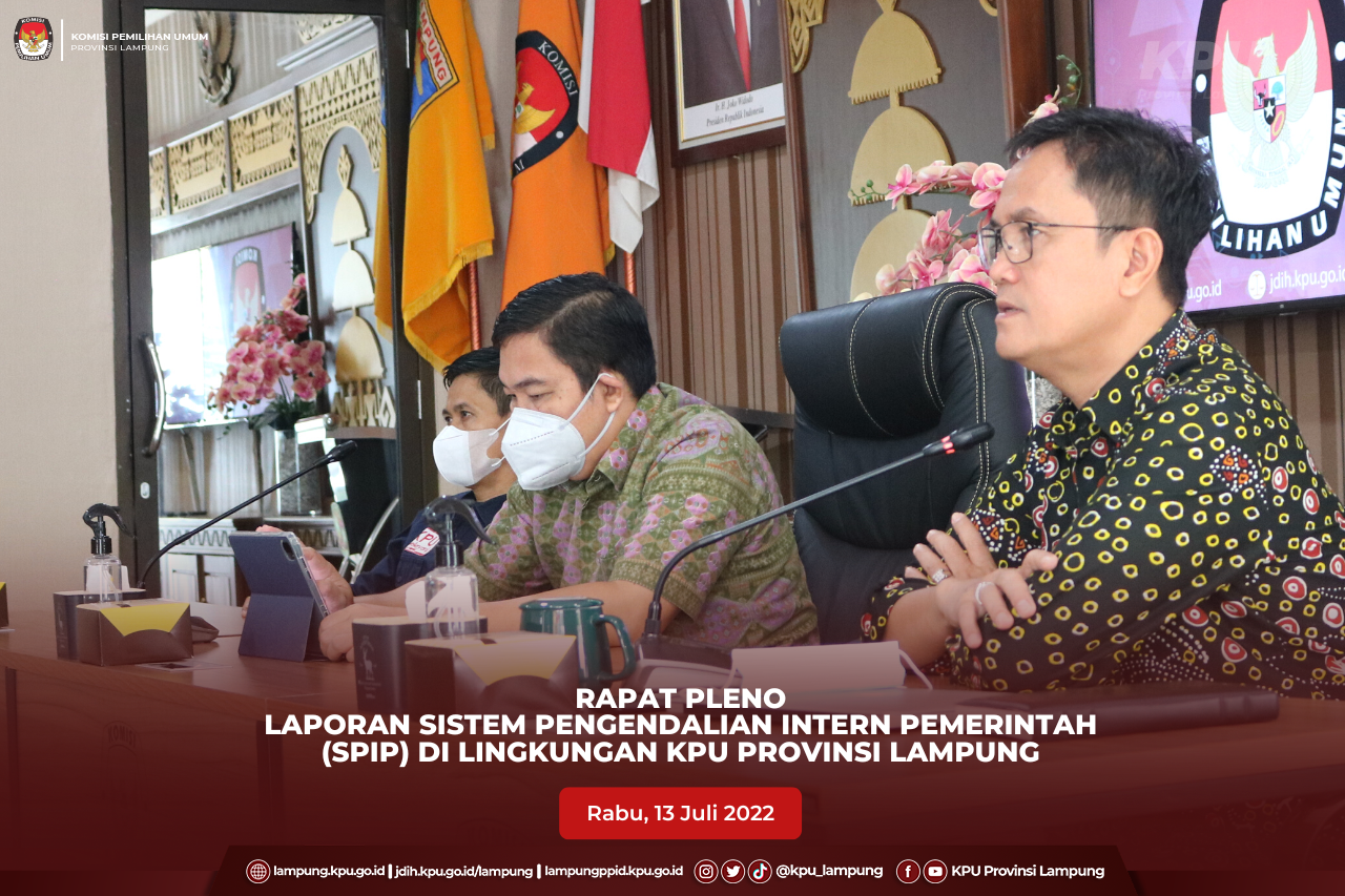 Banndar Lampung, KPU Provinsi Lampung melaksanakan Rapat Pleno Laporan Sistem Pengendalian Intern Pemerintah (SPIP) di lingkungan KPU Provinsi Lampung, Rabu (13/07). Kegiatan Rapat berlangsung di Aula KPU Provinsi Lampung dengan diikuti oleh Ketua, Erwan Bustami, Anggota M Tio Aliansyah, Antoniyus, Titik Sutriningsih, Ali Sidik, Ismanto, Kabag, Kasubbag dan Staf serta diikuti secara daring oleh KPU Kabupaten Kota Se Provinsi Lampung.