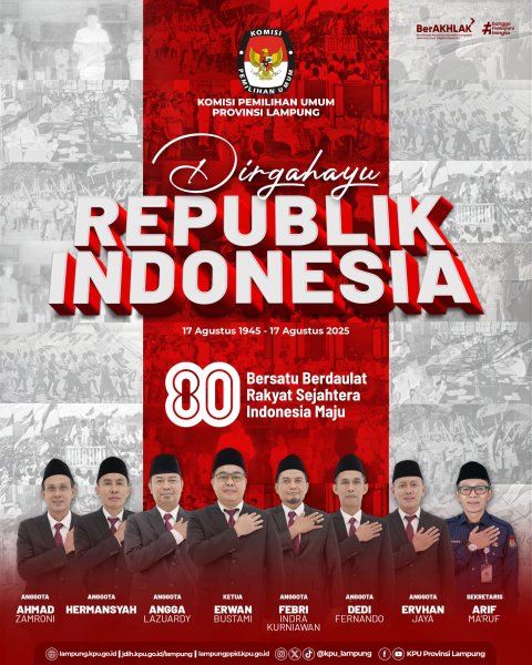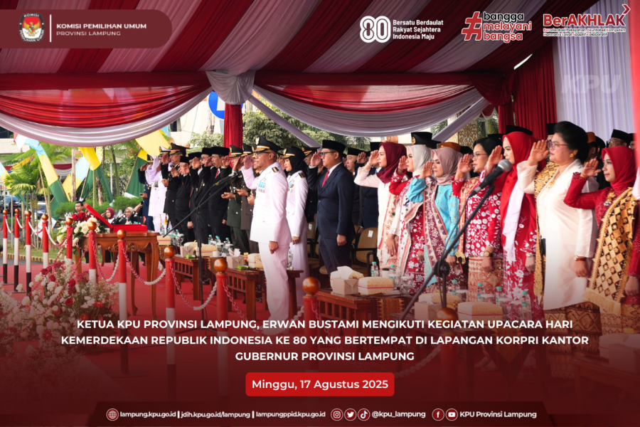 KPU Provinsi Lampung melaksanakan upacara dalam rangka memperingati Hari Kemerdekaan Republik Indonesia ke-80, sebagai wujud penghormatan kepada para pahlawan bangsa dan komitmen dalam menjaga demokrasi dan persatuan Republik Indonesia, (Minggu, 17 Agustus 2025).