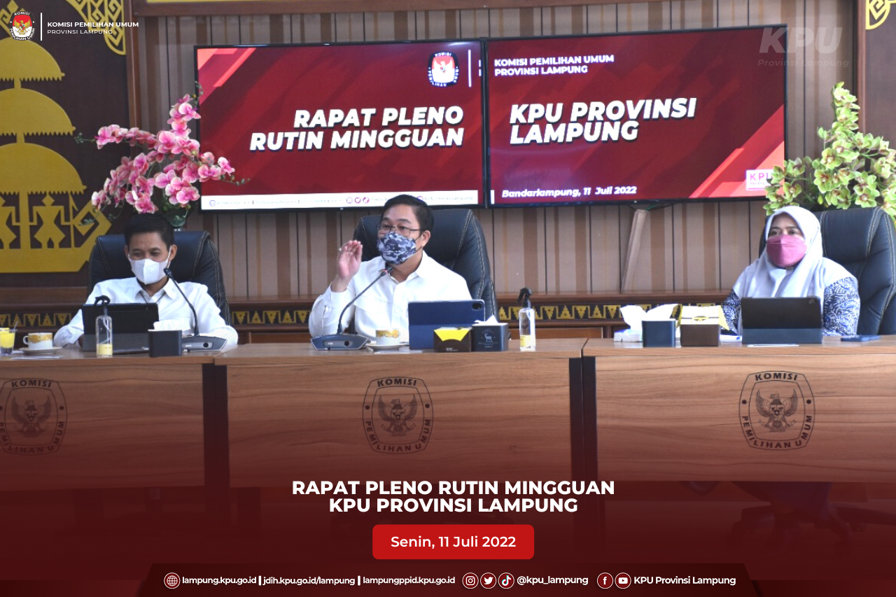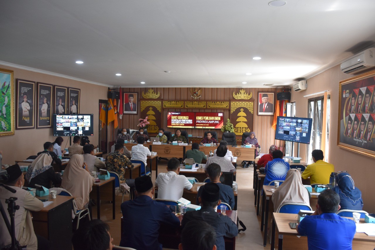 Bandar Lampung, KPU Provinsi Lampung melakukan rapat koordinasi rekapitulasi Pemutakhiran Data Pemilih Berkelanjutan untuk Semester 1 tahun 2022. Hadir dalam rapat koordinasi Bawaslu Provinsi Lampung, Korem Garuda Hitam 043, Polda Lampung, Dinas Kependudukan dan Pencatatan Sipil Provinsi Lampung, Kepala Kesbangpol Provinsi Lampung, serta para pengurus partai politik tingkat provinsi Lampung dan melibatkan KPU Kabupaten/Kota se Provinsi Lampung.
