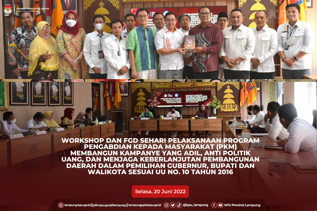 #TemanPemilih, FISIP Universitas Lampung berkerjasama dengan KPU Provinsi Lampung menyelenggarakan kegiatan Workshop dan FGD Sehari Pelaksanaan Program Pengabdian Kepada Masyarakat (PKM) dengan tema Membangun Kampanye yang Adil, Anti Politik Uang, dan Menjaga Keberlanjutan Pembangunan Daerah Dalam Pemilihan Gubernur, Bupati Dan Walikota Sesuai UU No. 10 Tahun 2016, Senin (20/06). Kegiatan yang berlangsung di Aula KPU Provinsi Lampung ini dibuka oleh Ketua KPU Provinsi Lampung, Erwan Bustami dan kemudian dilanjutkan dengan sambutan dari Ketua Tim FGD Program Pengabdian kepada Masyarakat, Nanang Trenggono. Hadir dalam kegiatan Anggota dan Sekretaris KPU Provinsi Lampung beserta Kabag dan Kasubbag, 5 Ketua KPU Kabupaten Kota, serta Tim FGD Program Pengabdian kepada Masyarakat.