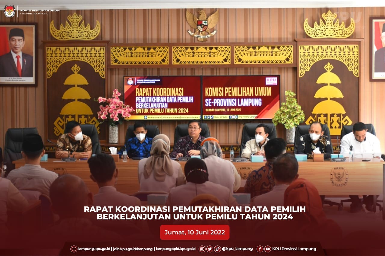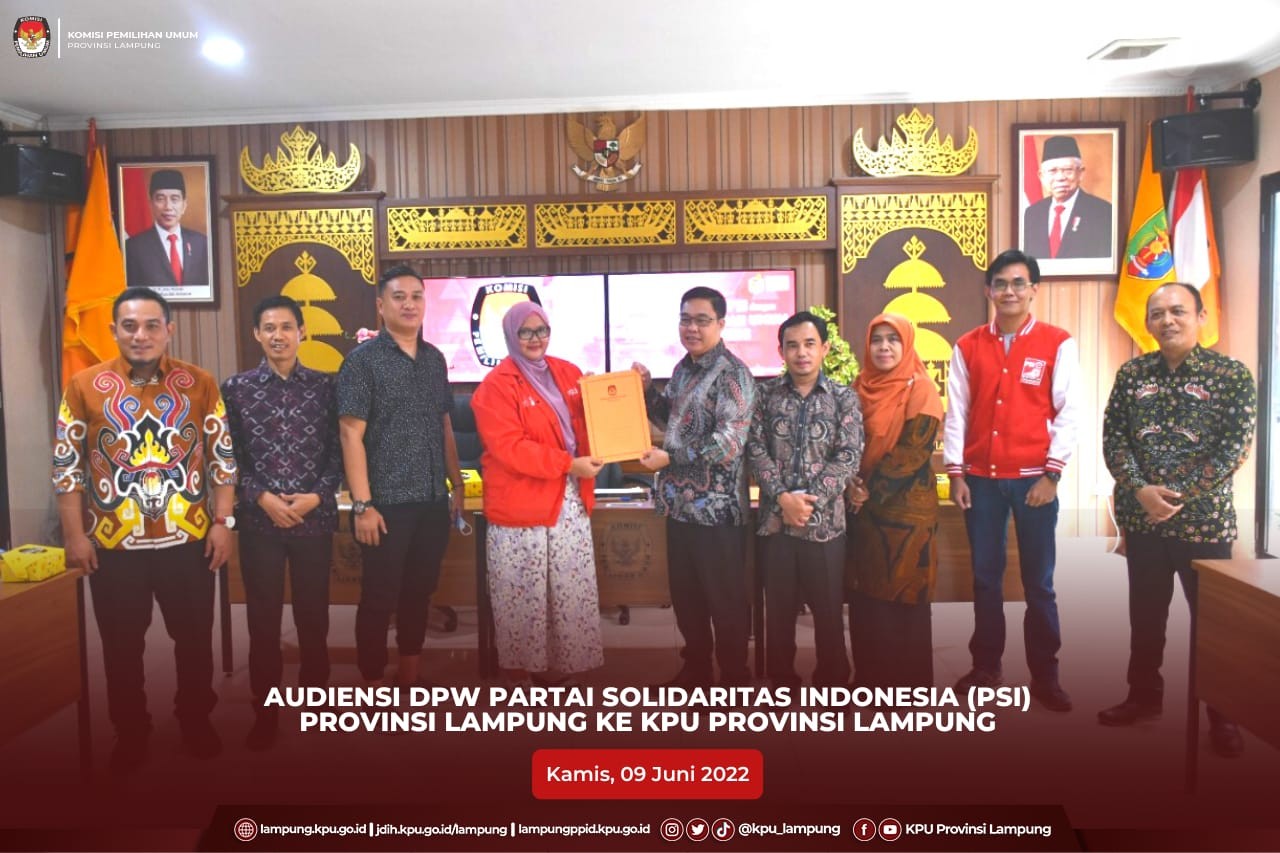 Bandar Lampung, KPU Provinsi Lampung (Ketua, Erwan Bustami bersama Anggota Ismanto, Antoniyus, Titik Sutriningsih, Agus Riyanto, Ali Sidik, Kabag Teknis, Parmas dan Humas, Yustian Umri Sangon dan kasubbag Teknis, Ismail menerima audiensi DPW Partai Solidaritas Indonesia (PSI) Provinsi Lampung di Aula Kantor KPU Provinsi Lampung, Kamis (09/06). Kegiatan audiensi yang dilaksanakan dalam rangka koordinasi dan silaturahmi pengurus DPW PSI Provinsi Lampung ini, juga bertunjuan untuk mendapatkan informasi terkait tahapan verifikasi partai politik untuk menjadi peserta Pemilu tahun 2024.