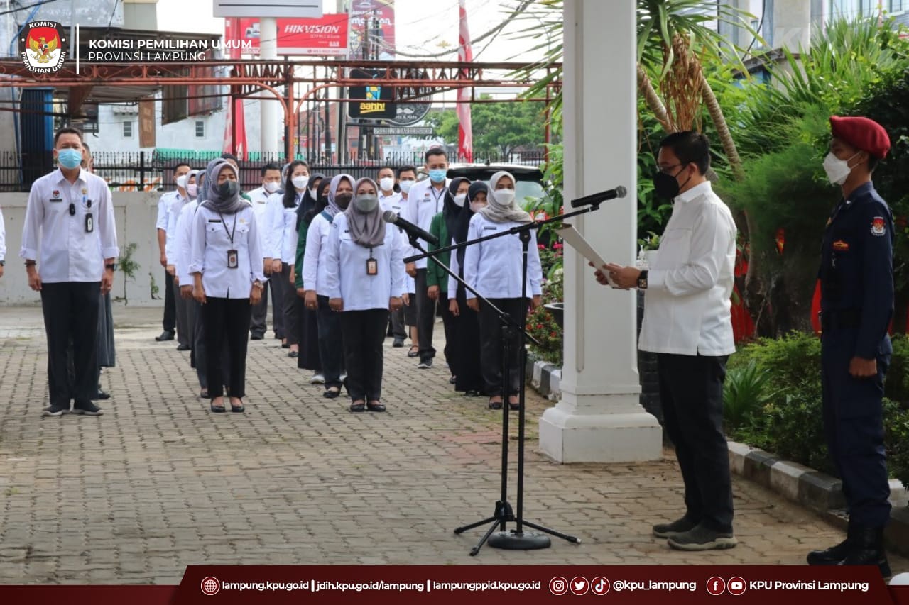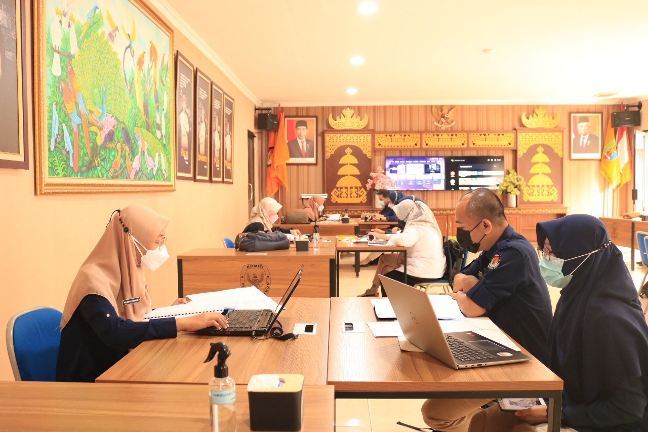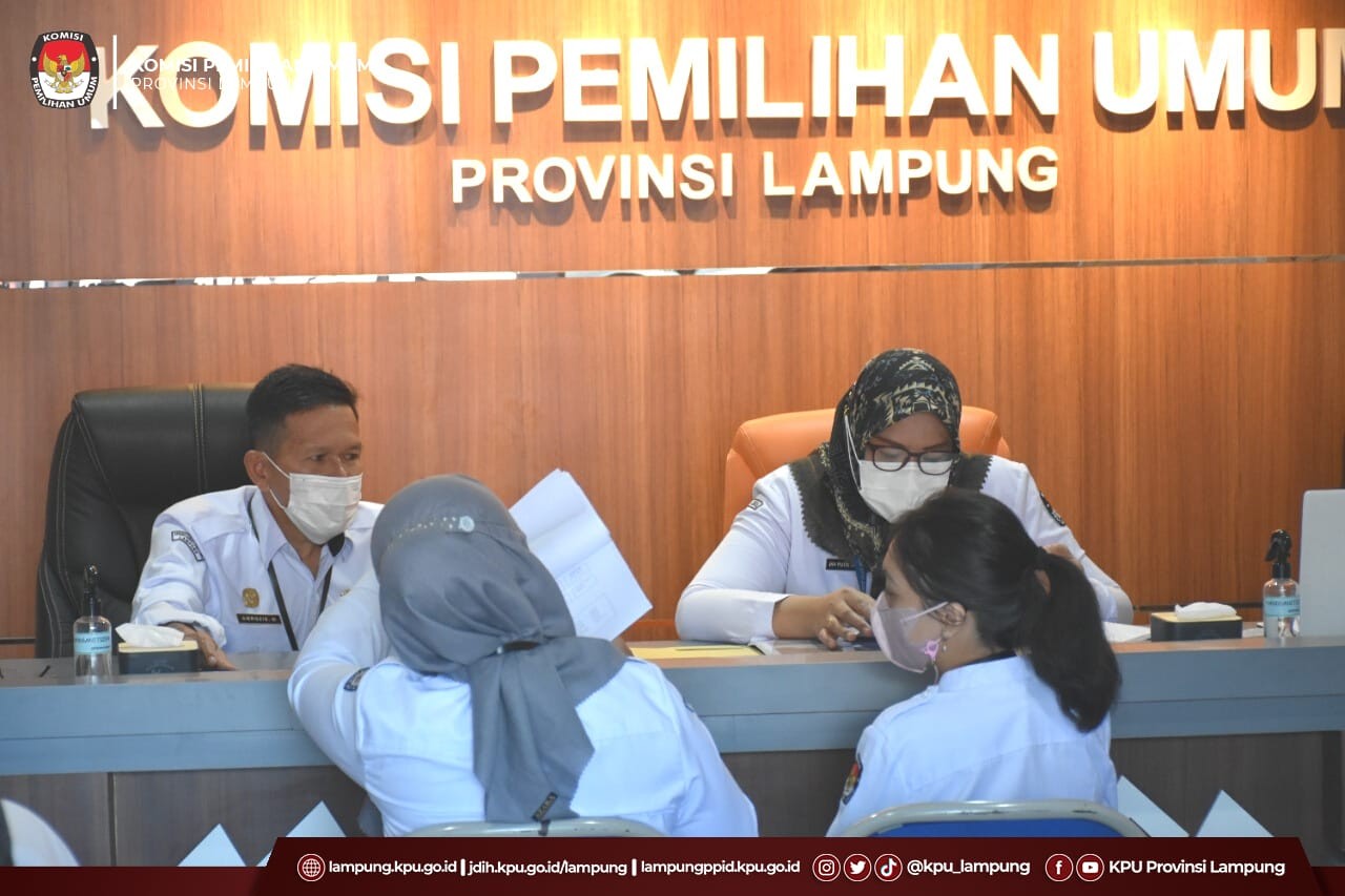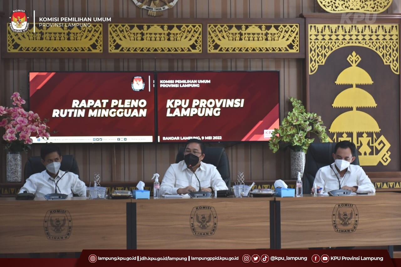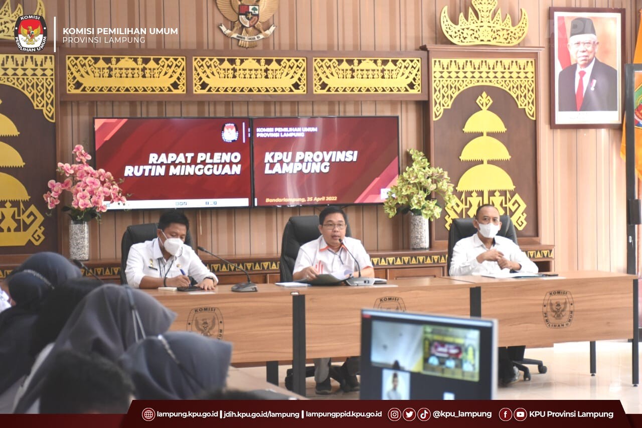Bandar Lampung, KPU Provinsi Lampung melaksanakan Rapat Pleno Rutin Mingguan di aula kantor KPU Provinsi Lampung, Senin (09/05/2022). Kegiatan Rapat yang dipimpin oleh Ketua KPU Provinsi Lampung, Erwan Bustami dihadiri oleh Anggota KPU Provinsi Lampung, Antoniyus, Agus Riyanto, M Tio Aliansyah, Ali Sidik, Titik Sutriningsih, Ismanto, dan Sekretaris, Mashur Sampurna Jaya, beserta kabag dan kasubbag.