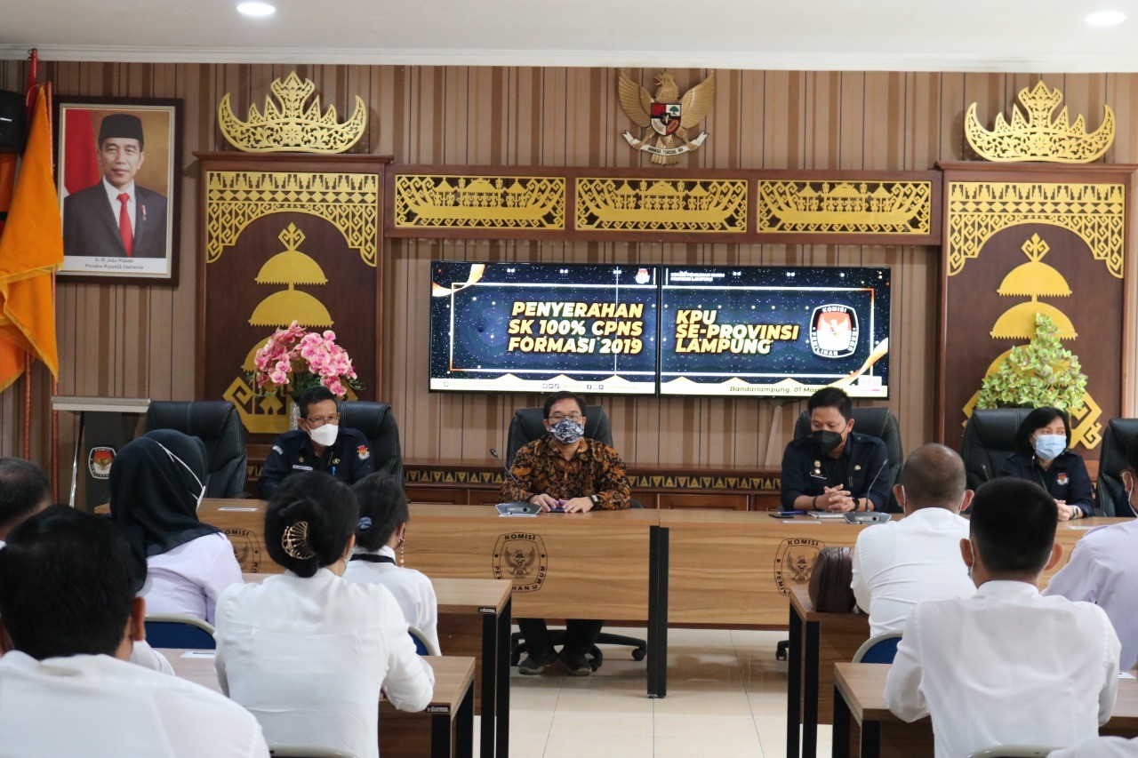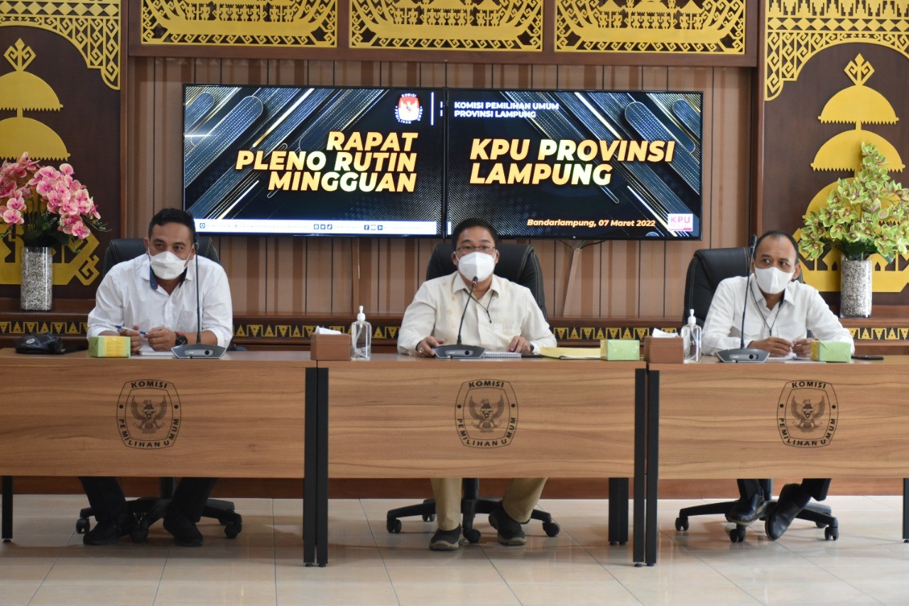 bandar lampung, KPU Provinsi Lampung melaksanakan Rapat Pleno Laporan Sistem Pengendalian Intern Pemerintah (SPIP) di Aula Kantor Setempat, Senin (14/01). Kegiatan Rapat yang dibuka oleh Ketua KPU Provinsi Lampung, Erwan Butsami, kemudian dipimpin oleh Ketua Divisi Hukum dan Pengawasan, M Tio Aliansyah. Kegiatan diikuti oleh Anggota KPU Provinsi Lampung, Ali Sidik, Titik Sutriningsih, dan Sekretaris Mashur Sampurna Jaya beserta Kabag, Subkoordinator dan Bendahara Pengeluaran. Sedangkan Anggota KPU Provinsi Lampung, Agus Riyanto hadir secara daring.