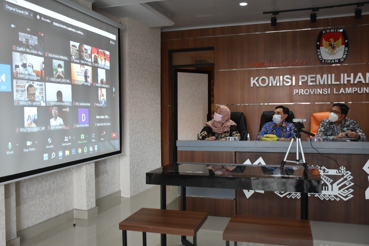 Bandar Lampung, KPU Provinsi Lampung melaksanakan Rapat Pleno Rutin Mingguan di aula kantor KPU Provinsi Lampung, Senin (31/01). Kegiatan Rapat yang dipimpin oleh Ketua KPU Provinsi Lampung, Erwan Bustami dihadiri oleh Anggota KPU Provinsi Lampung, Ismanto dan M Tio Aliansyah, Sekretaris, Mashur Sampurna Jaya, Kepala Bagian dan Subkoordinator. Sementara Anggota KPU Provinsi Lampung Antoniyus, Agus Riyanto, Ali Sidik dan Titik Sutriningsih hadir via daring.
