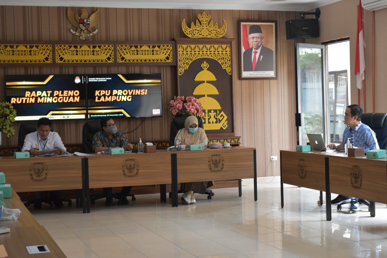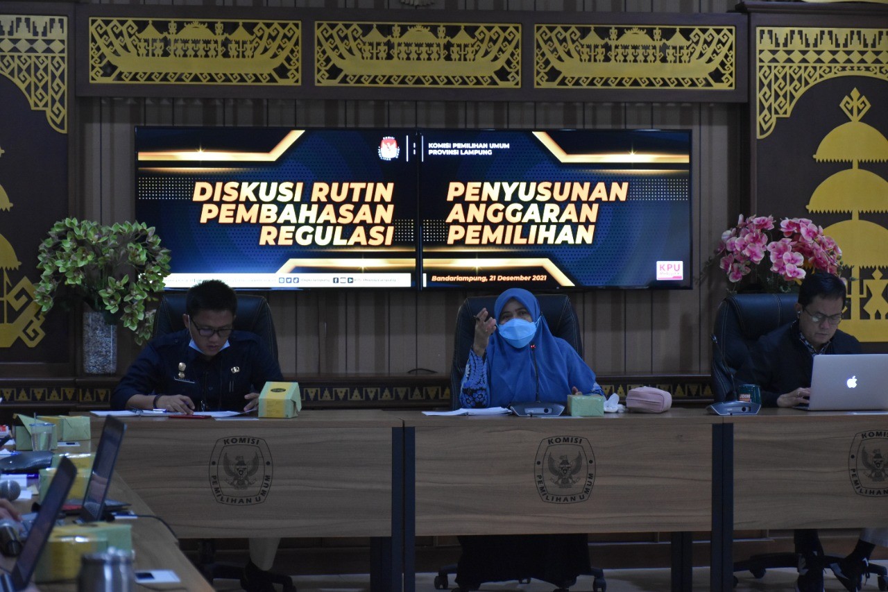 Bandar Lampung, KPU Provinsi Lampung mengadakan diskusi rutin Pembahasan Regulasi Penyusunan Anggaran Pemilihan, Selasa (21/12). Kegiatan diskusi yang dibuka oleh Ketua Divisi Perencanaan dan Logistik, Titik Sutriningsih ini diikuti oleh Ketua KPU Provinsi Lampung Erwan Bustami, Ketua Divisi Hukum dan Pengawasan, M Tio Aliansyah, Ketua Divisi SDM dan Litbang, Ali Sidik, Ketua Divisi Sosialisasi, Pendidikan Pemilih dan Partisipasi Masyarakat, Antoniyus, Ketua Divisi Data dan Infromasi, Agus Riyanto, Sekretaris KPU Provinsi Lampung, Mashur Sampurna Jaya serta Koordinator dan Subkoordinator.