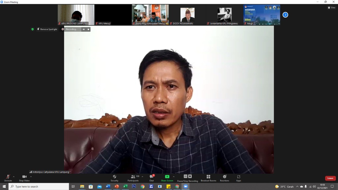 Bandar Lampung, Seri Kelimabelas Webinar Diskusi Demokrasi dan Kepemiluan dengan tema “Peran Pemerintah Daerah dalam Pemilu dan Pemilihan" telah berlangsung secara daring, Kamis (02/12). Kali ini diskusi diselenggarakan oleh KPU Kabupaten Mesuji. Kegiatan dibuka oleh ketua KPU Kabupaten Mesuji, Ali Yasir. Dengan dimoderatori oleh Anggota KPU Kabupaten Mesuji, Eko Sumarsono kegiatan diisi oleh Asisten Ahli Bupati Mesuji, Adi Sukamto yang mewakili Bupati Mesuji sebagai Narasumber. Turut hadir anggota KPU Provinsi Lampung Ali Sidik dan sebagai pemantik diskusi Anggota KPU Provinsi Lampung Divisi Sosdiklih Parmas, Antoniyus. Dalam kesempatan ini Antoniyus sebagai pemantik menyampaikan bahwa sesuai dengan Pasal 434 ayat (1) Undang-undang Nomor 7 Tahun 2017 Untuk kelancaran pelaksanaan tugas, wewenang dan kewajiban Penyelenggara Pemilu, Pemerintah dan Pemerintah Daerah WAJIB memberikan bantuan dan fasilitas sesuai dengan ketentuan peraturan perundang-undangan. Terkait hal tersebut keterlibatan pemerintah daerah juga dapat dilakukan dengan mengikut sertakan stakeholder pada tahapan pemilu dan pemilihan dalam rangka menyukseskan pesta demokrasi di tahun 2024 mendatang. Diskusi Rutin yang dibuka secara umum ini diinisiasi KPU Provinsi Lampung dan berlangsung setiap hari Kamis/Jumat dengan narasumber dari KPU Kabupaten Kota secara bergiliran.