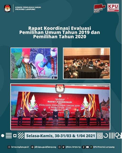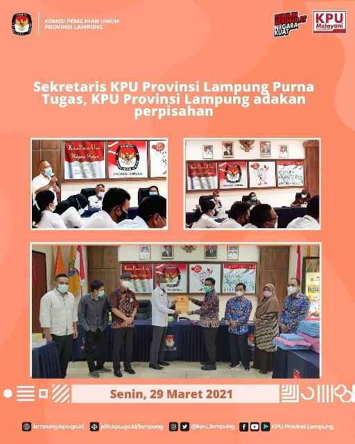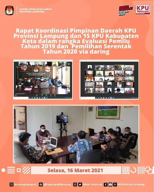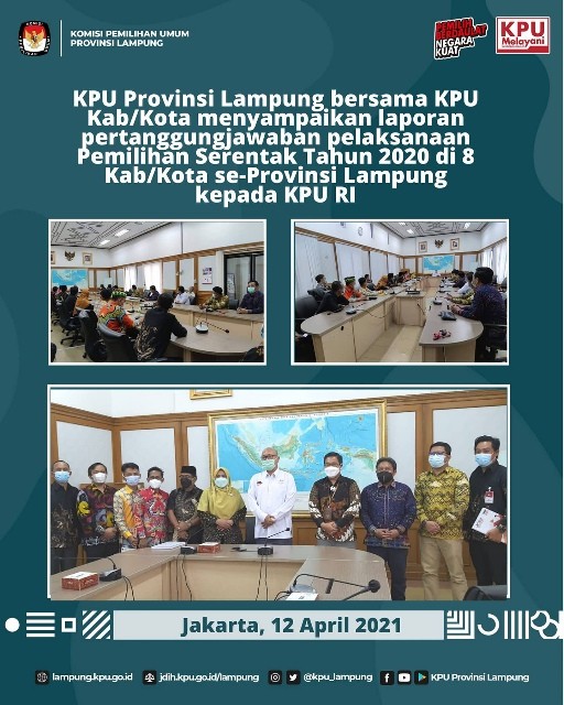 Jakarta, KPU Provinsi Lampung bersama KPU Kabupaten Kota menyampaikan laporan pertanggungjawaban pelaksanaan Pemilihan Serentak Tahun 2020 di 8 Kabupaten Kota se Provinsi Lampung kepada KPU RI. Kegiatan diterima langsung oleh Plt Ketua KPU RI, Ilham Saputra di Kantor KPU RI, Senin (12/4).