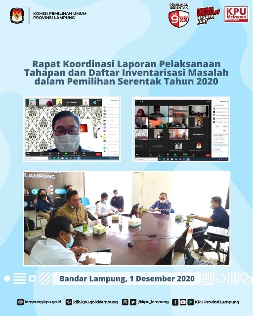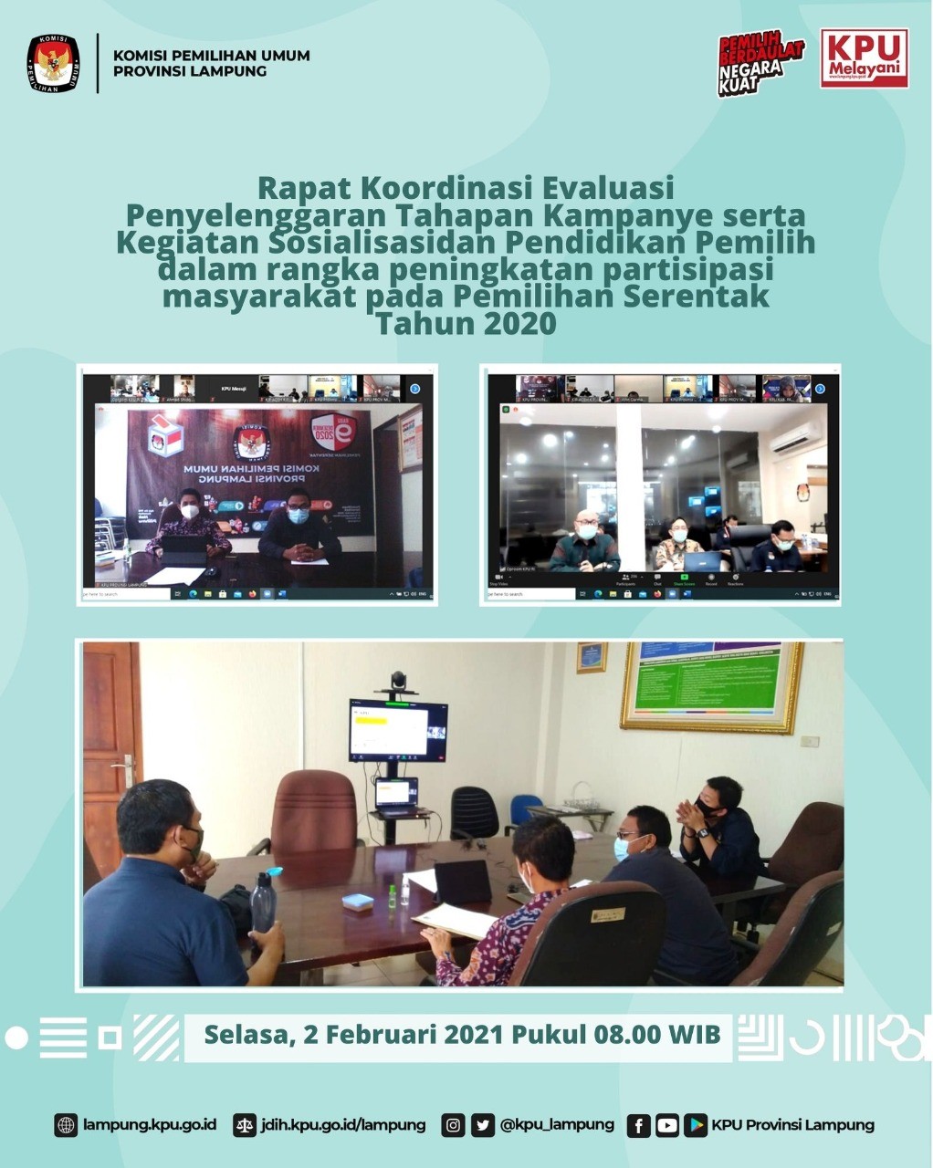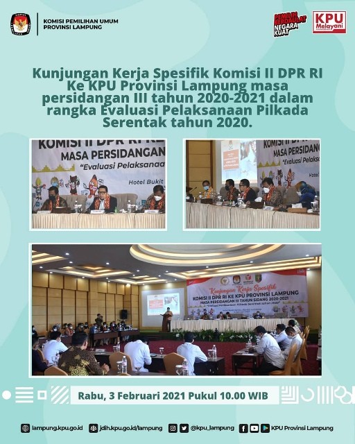 Bandar Lampung, KPU Provinsi Lampung menerima Kunjungan Kerja Spesifik Komisi II DPR RI Ke KPU Provinsi Lampung masa persidangan III tahun 2020-2021 dalam rangka Evaluasi Pelaksanaan Pilkada Serentak tahun 2020, Rabu (3/2). Kegiatan yang berlangsung di Hotel Bukit Randu ini diikuti oleh KPU Provinsi Lampung beserta 8 KPU Kabupaten Kota, Bawaslu Provinsi Lampung beserta 8 Bawaslu Kabupaten Kota. Kegiatan kunjungan Komisi II DPR RI ini didampingi oleh sekjen KPU RI, Ketua Bawaslu RI.l dan perwakilan dari Kementerian Dalam Negeri RI. "Pilkada Serentak tahun 2020 ini secara keseluruhan bisa dibilang sukses hal ini dapat dilihat dari berbagai indikator seperti tahapan pemilihan yang berjalan dengan baik, antusiasme masyarakat yang tinggi hal ini dibuktikan dengan meningkatnya tingkat partisipasi pemilih dibandingkan dengan pilkada sebelumnya dan semua yang terlibat dalam pemilihan selamat dan sehat hal ini dibuktikan dengan tidak menemukan cluster baru dari pelaksanaan pilkada"ungkap Ketua Komisi II DPR RI, Ahmad Doli Kurnia Tandjung dalam Kunjungan Kerja Spesifik Komisi II DPR RI Ke KPU Provinsi Lampung masa persidangan III tahun 2020-2021 dalam rangka Evaluasi Pelaksanaan Pilkada Serentak tahun 2020. Rabu, 3 Februari 2021. Demi terlaksananya Pemilihan yang lebih baik dalam pemilihan berikutnya program berikutnya perlu adanya evaluasi. Komisi II DPR RI membentuk panja evaluasi pilkada serentak 2020 yang Dibagi 3 wilayah yaitu Lampung, Jawa Barat dan Banten. 3 hal yang menjadi sorotan dalam evaluasi yaitu proses sengketa di MK, Permasalahan DPT dan Pola koordinasi antar lembaga Pemilu lanjutnya. Selanjutnya kegiatan dilanjutkan dengan pemaparan KPU Provinsi Lampung dan Bawaslu Provinsi Lampung yang diakhiri dengan diskusi dan penyampaian dari anggota Komisi II DPR RI. #KPUMelayani