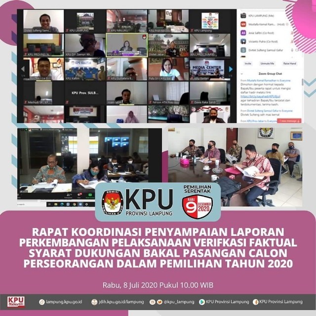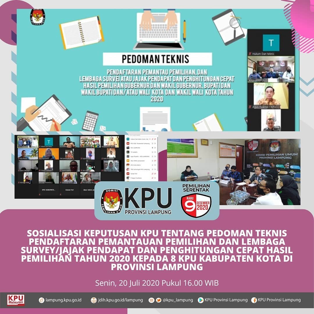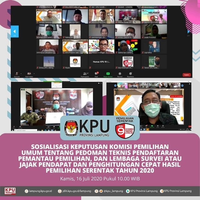KPU Provinsi Lampung mengadakan kegiatan Sosialisasi Keputusan KPU tentang Pedoman Teknis Pendaftaran Pemantauan Pemilihan dan Lembaga Survey/Jajak Pendapat dan Penghitungan Cepat Hasil Pemilihan Tahun 2020 kepada 8 KPU Kabupaten Kota yang melaksanakan Pemilihan di Provinsi Lampung, Senin (20/7). Kegiatan yang berlangsung di ruang rapat ketua KPU Provinsi Lampung secara daring tersebut dibuika oleh ketua KPU Provinsi. Antoniyus, SIP menjelaskan bahwa Pendaftaran Pendaftaran Pemantau Pemilihan dalam negeri berlangsung pada 1 November 2019 Sampai 2 Desember 2020 dan pendaftaran Pemantau Pemilihan Asing, Lembaga Survei atau Jajak Pendapat dan Penghitungan Cepat Hasil Pemilihan berlangsung pada 1 November 2019 sampai 8 November 2020. Pendaftaran dapat langsung ke kantor KPU RI bagi pemantau asing atau ke KPU Kabupaten Kota yang melaksanakan Pemilihan Bagi Pemantau Dalam Negri dan Lembaga Survei atau Jajak Pendapat dan Penghitungan Cepat Hasil Pemilihan. Kegiatan menerapkan protokol kesehatan Pencegahan penyebaran Covid-19. Atau Pendaftaran juga dapat melalui Online dengan mengirimkan email dan dokumen asli dikirimkan ke kantor KPU. Syarat Pendaftaran Pemantau Asing 1. bersifat independen; 2. mempunyai sumber dana yang jelas; 3. terdaftar dan memperoleh Akreditasi dari KPU; 4. mempunyai kompetensi dan pengalaman sebagai pemantau Pemilihan di negara lain yang dibuktikan dengan surat pernyataan dari organisasi pemantau yang bersangkutan atau dari pemerintah negara lain tempat yang bersangkutan pernah melakukan pemantauan; 5. memperoleh visa untuk menjadi Pemantau Pemilihan dari perwakilan Republik Indonesia di luar negeri; 6. memenuhi tata cara melakukan pemantauan yang diatur dalam peraturan perundang-undangan; dan 7. melapor dan mendaftar ke KPU atas rekomendasi Kementerian Luar Negeri. Syarat Pendaftaran Pemantau Pemilihan Dalam Negeri 1. bersifat independen; 2. mempunyai sumber dana yang jelas; 3. terdaftar dan memperoleh Akreditasi dari KPU Provinsi atau KPU Kabupaten/Kota; 4. mempunyai kompetensi dan pengalaman sebagai pemantau Pemilihan yang dibuktikan dengan surat pernyataan dari organisasi pemantau yang bersangkutan atau dari pemerintah; 5. memenuhi tata cara melakukan pemantauan yang diatur dalam peraturan perundang-undangan. Dokumen Persyaratan Lembaga Survei atau Jajak Pendapat dan Penghitungan Cepat 1. formulir III.1, yaitu formulir pendaftaran Lembaga Survei atau Jajak Pendapat Pemilihan dan Penghitungan Cepat Hasil Pemilihan, yang ditandatangani oleh pimpinan Lembaga Survei atau Jajak Pendapat Pemilihan dan Penghitungan Cepat Hasil Pemilihan dan dibubuhi stempel Lembaga; 2. salinan akte pendirian/badan hukum lembaga; 3. susunan kepengurusan lembaga; 4. surat keterangan domisili dari desa atau sebutan lain/kelurahan atau instansi pemerintahan setempat; 5. surat keterangan dari instansi yang berwenang yang menyatakan lembaga pelaksana Survei atau Jajak Pendapat dan pelaksana Penghitungan Cepat Hasil Pemilihan telah bergabung dalam asosiasi lembaga atau Jajak Pendapat; 6. pas foto berwarna pimpinan lembaga, ukuran 4x6 cm (empat kali enam) sentimeter sebanyak 4 (empat) lembar; 7. formulir III.2, yaitu surat pernyataan mengenai kepatuhan Lembaga Survei atau Jajak Pendapat Pemilihan dan Penghitungan Cepat Hasil Pemilihan pada peraturan perundang-undangan, bahwa lembaga: o tidak melakukan keberpihakan yang menguntungkan atau merugikan peserta Pemilihan; o tidak mengganggu proses penyelenggaraan tahapan Pemilihan; o bertujuan meningkatkan Partisipasi Masyarakat secara luas; o mendorong terwujudnya suasana kondusif bagi penyelenggaraan Pemilihan yang aman, damai, tertib, dan lancar; o benar-benar melakukan wawancara dalam pelaksanaan survei atau jajak pendapat; o tidak mengubah data lapangan maupun dalam pemrosesan data; o menggunakan metode penelitian ilmiah; dan o melaporkan metodologi pencuplikan data (sampling), sumber dana, jumlah responden, tanggal dan tempat pelaksanaan Survei atau Jajak Pendapat dan Penghitungan Cepat Hasil Pemilihan; dan 8. formulir III.3, yaitu surat pernyataan sumber dana yang ditandatangani oleh ketua Lembaga Survei atau Jajak Pendapat Pemilihan dan Penghitungan Cepat Hasil Pemilihan. Tatacara Pendaftaran Pendaftaran Langsung 1. Pendaftaran secara langsung dilakukan dengan menerapkan protokol kesehatan pencegahan penyebaran Corona Virus Disease 2019 (COVID-19). 2. Tim Petugas KPU, KPU Provinsi atau KPU Kabupaten/Kota menyiapkan: a. tempat pendaftaran dengan sirkulasi udara yang baik; b. sarana sanitasi yang memadai, paling kurang berupa fasilitas cuci tangan c. dan/atau antiseptik berbasis alkohol, dan disinfektan; b. alat tulis. 3. Tim Petugas KPU, KPU Provinsi atau KPU Kabupaten/Kota memastikan: a. kebersihan tempat pendaftaran dan perlengkapan lainnya; b. pengaturan jarak antar tempat duduk yang sesuai dengan protokol kesehatan pencegahan penyebaran Corona Virus Disease 2019 (COVID-19); c. pembatasan jumlah orang yang berada di ruangan pada saat pendaftaran; d. pengaturan daftar antrean Calon Pemantau Pemilihan, Lembaga Survei atau Jajak Pendapat, dan Penghitungan Cepat Hasil Pemilihan yang akan mendaftar; e. tidak terjadi kerumunan masa. 4. Tim Petugas KPU, KPU Provinsi atau KPU Kabupaten/Kota dan Calon Pemantau Pemilihan, Lembaga Survei atau Jajak Pendapat, dan Penghitungan Cepat Hasil Pemilihan, pada saat pendaftaran: a. wajib memakai masker atau alat pelindung diri lainnya; b. menghindari jabat tangan atau kontak fisik; dan c. menggunakan alat tulis masing-masing. 5. Calon Pemantau Pemilihan, Lembaga Survei atau Jajak Pendapat, dan Penghitungan Cepat Hasil Pemilihan menyerahkan dokumen persyaratan yang dibungkus dengan map tahan air. 6. Tim Petugas KPU, KPU Provinsi atau KPU Kabupaten/Kota melakukan penyemprotan sebelum membuka dan meneliti kelengkapan dokumen persyaratan. Tidak Langsung: 1. Calon Pemantau Pemilihan, Lembaga Survei atau Jajak Pendapat, dan Penghitungan Cepat Hasil Pemilihan mengunduh formulir pendaftaran melalui laman KPU, KPU Provinsi 