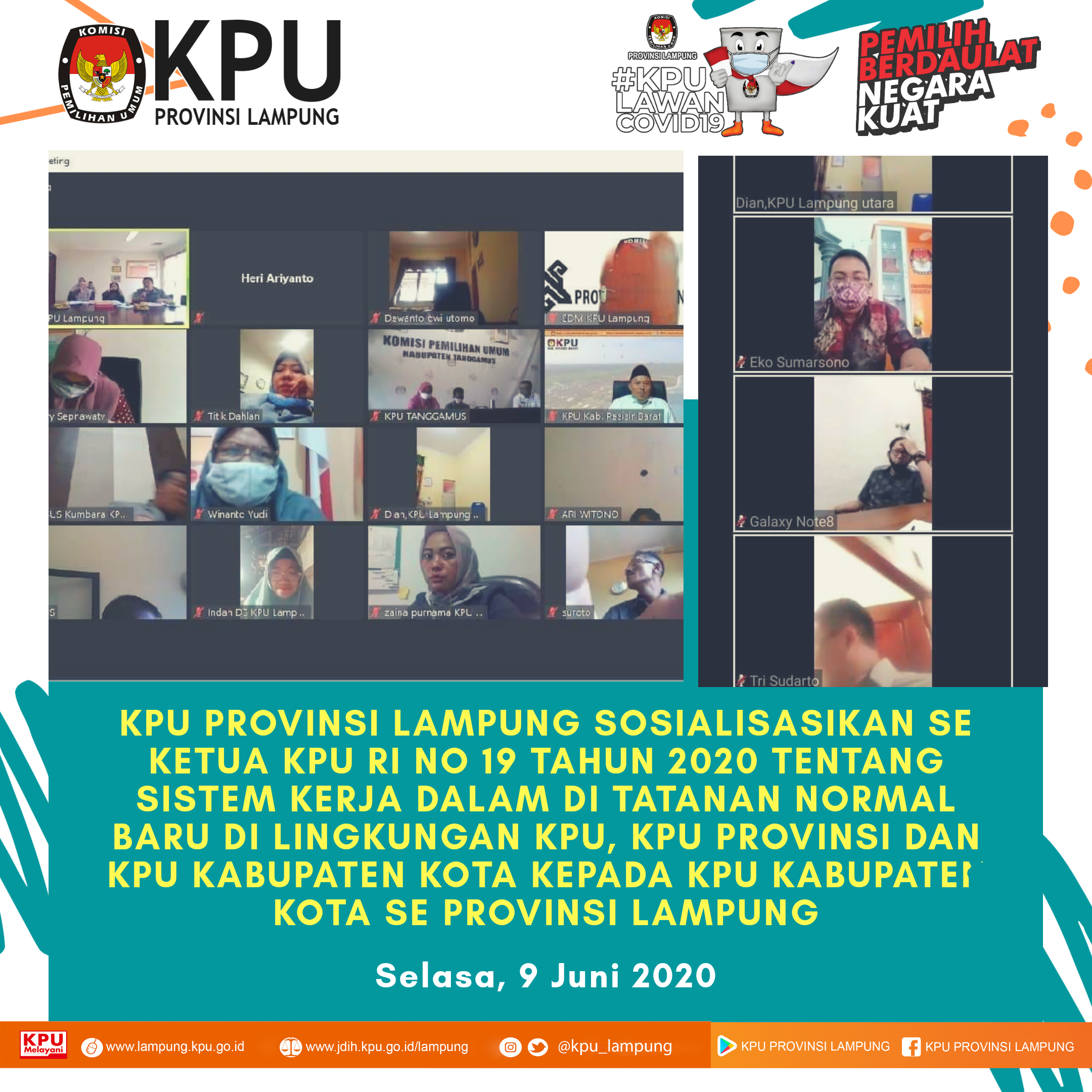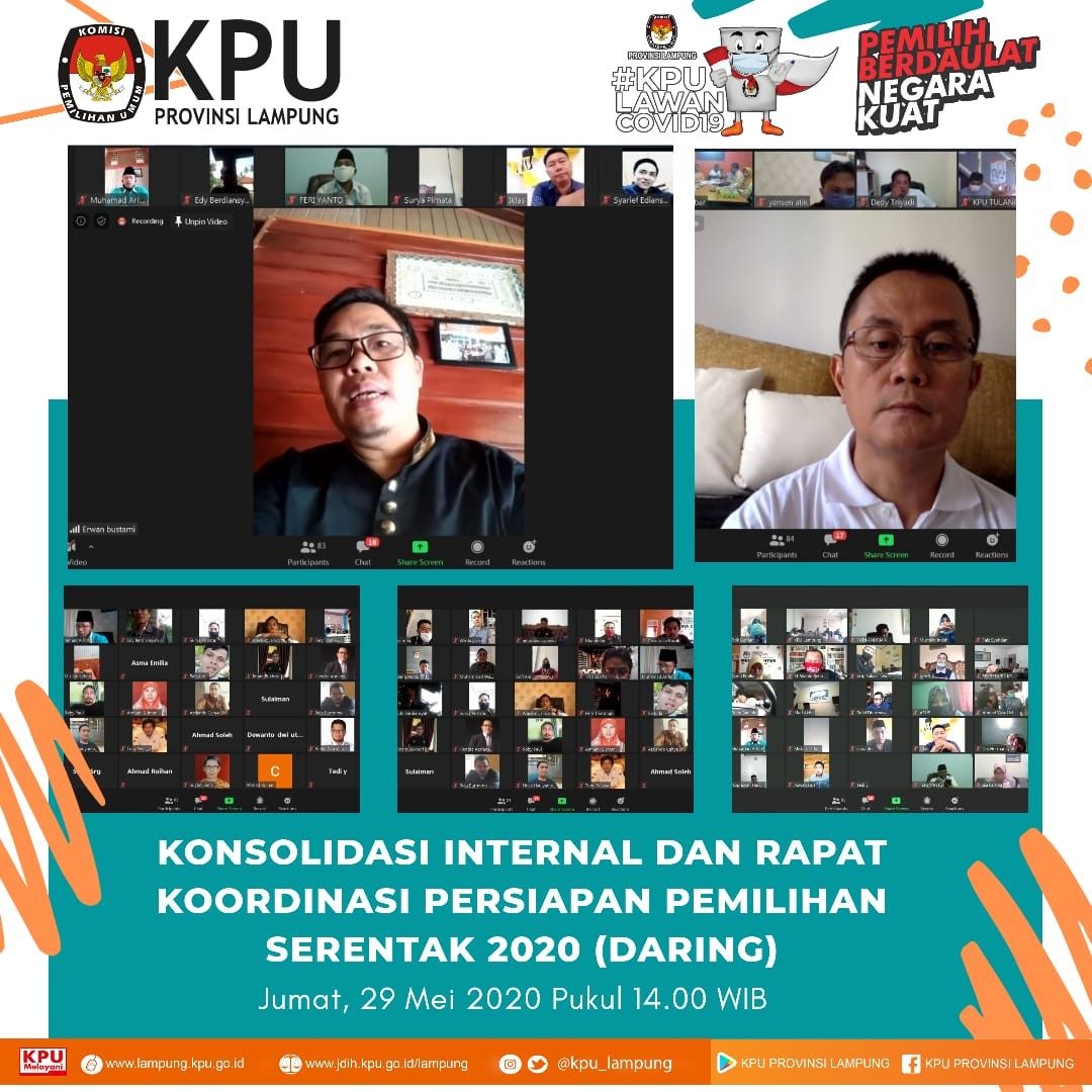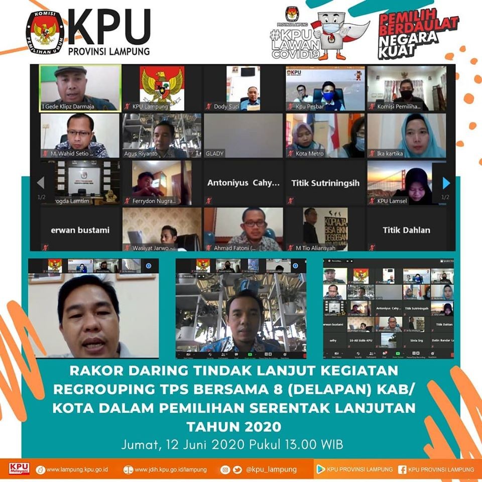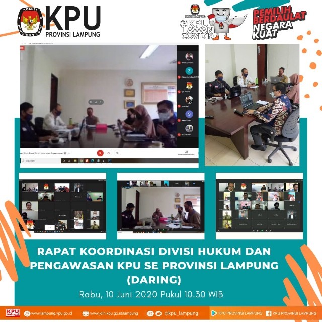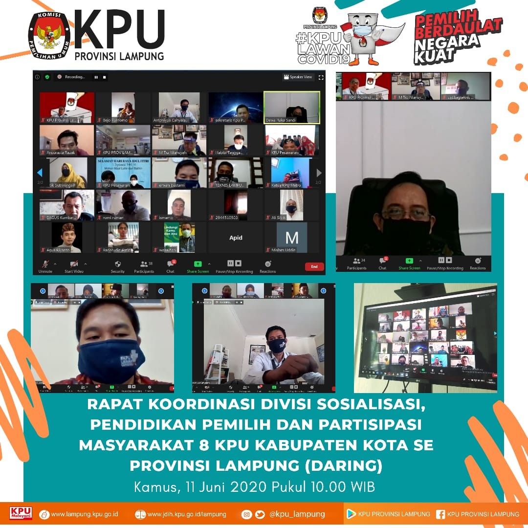KPU Provinsi Lampung melaksanakan kegiatan Rapat Koordinasi Persiapan Pemilihan Serentak Lanjutan tahun 2020 Divisi Sosialisasi, Pendidikan Pemilih, Partisipasi Masyarakat bersama 8 KPU Kabupaten Kota di Provinsi Lampung, Kamis (11/06). Kegiatan dilaksanakan secara daring atau Rapat Virtual dengan diikuti oleh Divisi Sosialisasi, Pendidikan Pemilih, Partisipasi Masyarakat bersama 8 KPU Kabupaten Kota di Provinsi Lampung yang melaksanakan Pemilihan Serentak Lanjutan Tahun 2020. Kegiatan juka diisi arahan oleh Anggota KPU RI Divisi Sosialisasi, Pendidikan Pemilih, Partisipasi Masyarakat, I Dewa Kade Wiarsa Raka Sandi, ST., SH., M.Si. Dalam arahannya beliau menyampaikan bahwa Kegiatan Sosialisasi dan Pendidikan Pemilih dilaksanakan melalui media dalam jaringan (daring/online). KPU disetiap tingkatan baik KPU Provinsi maupun KPU Kabupaten Kota untuk memakasimalkan media sosial yang dimiliki untuk publikasi setiap tahapan yang berlangsung dan sekaligus sebagai media sosialisasi. Bagi daerah yang tidak memungkinkan untuk dilaksanakan sosialisasi melalui daring dapat dilaksankan secara langsung dengan memperhatikan protokol kesehatan seperti menggunakan masker, mejaga jarak, membatasi jumlah orang dalam ruangan (maksimal 20 orang) dan lainnya. Selanjutnya Anggota KPU Provinsi Lampung Divisi Sosialisasi, Pendidikan Pemilih, Partisipasi Masyarakat, Antoniyus, S.IP., menyampaikan bahwa KPU Kabupaten Kota harus keratif dalam menyampaikan informasi sosialisasi secara tidak langsungmelalui media sosial. Informasi tersebut dapat disampaikan melalui visual (desain grafis) atau audio visual (video). Apabila sosialisasi dilakukan secara langsung beliau menghimbau untuk menaati protokol kesehatan sesuai dengan perundnag-undnagan yang berlaku. "harus dipahami bahwa dalam situasi ditengah pandemi, seluruh kegiatan tahapan Pemilihan Serentak Lanjutan Tahun 2020 harus menerapkan protokol kesehatan, baik saat dikantor maupun saat sosialisasi secara langsung kepada masyarakat"ungkapnya. selain itu ia juga meminta untuk KPU Kabupaten Kota dapat mengaktifkan kembali Rumah Pintar Pemilu (RPP). Inovasi lain yaitu dapat membuat kelas virtual dengan bekerjasama dengan sekolah atau kampus. (ARN/TKMS)