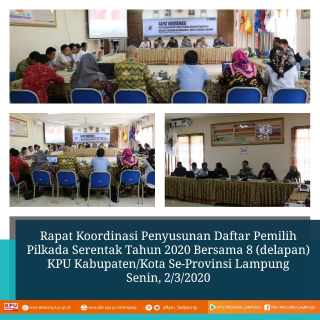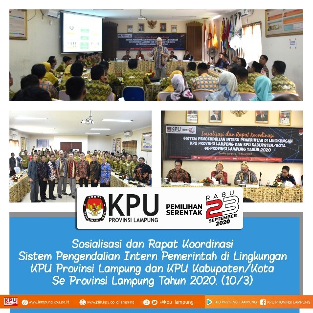 Komisi Pemilihan Umum Provinsi Lampung melaksanakan kegiatan Sosialisasi dan rapat koordinasi sistem Pengendalian Intern Pemerintah di Lingkungan KPU provinsi Lampung dan KPU Kabupaten/Kota Se-Provinsi Lampung Tahun 2020, Selasa (10/03). Kegiatan yang dilaksanakan di Aula KPU Provinsi Lampung ini dibuka secara langsung oleh Anggota KPU RI, Pramono Ubaid Tanthow.
