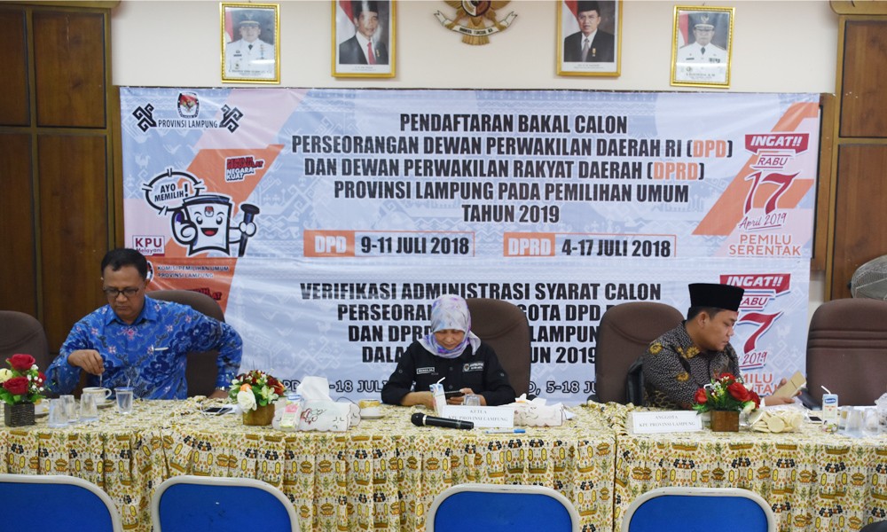 KPU Provinsi Lampung telah melaksanakan Pendaftaran Calon Anggota Dewan Perwakilan Rakyat Daerah (DPRD) Provinsi Lampung dalam Pemilihan Umum Tahun 2019. Pendaftaran dimulai dari hari rabu s/d selasa tanggal 04 s/d 17 Juli 2018 sampai dengan Pukul 24:00. Kegiatan dilaksanakan di Kantor KPU Provinsi Lampung.