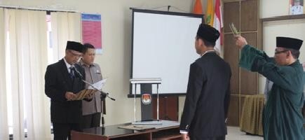Bandar Lampung, kpud-lampungprov.go.id. Komisi Pemilihan Umum Provinsi Lampung, Kamis (10/3), Ketua KPU Provinsi Lampung DR.Nanang Trenggono melantik anggota KPUD Kabupaten Lampung Barat Sdr. Karwan Sutiawan. ST menggantikan Sdr. Radityo A Nugroho, ST.,MM mengundurkan diri, sebagai pelaksanaan Keputusan KPU Provinsi Lampung Nomor : 1/Kpts/KPU-Prov.08/TAHUN 2016 tanggal 08 Maret 2016 tentang Pemberhentian dan Pengangkatan/Penetapan Anggota KPU Kabupaten Lampung Barat Pengganti Antar Waktu Periode 2014-2019, melaksanakan pengucapan sumpah dan janji di hadapan rohaniawan.