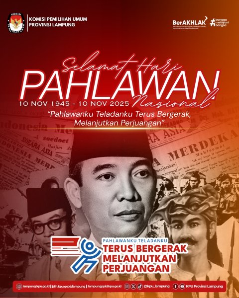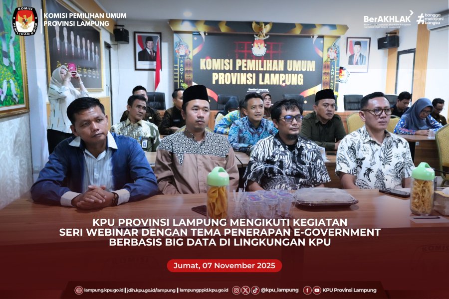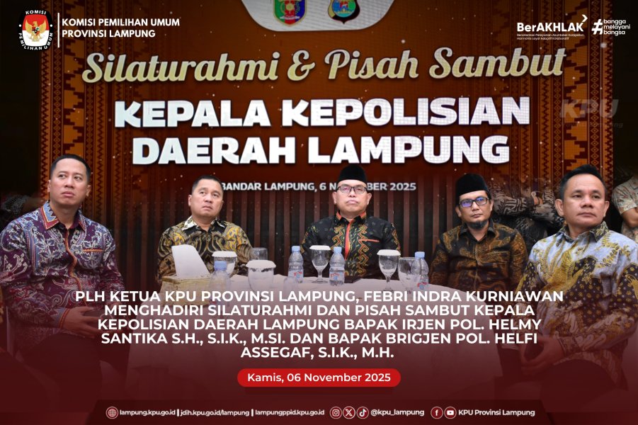 Pelaksana Harian Ketua KPU Provinsi Lampung, Febri Indra Kurniawan, menghadiri kegiatan Temu Pamit Kepala Kepolisian Daerah Lampung, yaitu Bapak Brigjen Pol. Helfi Assegaf, S.I.K., M.H. dan Bapak Irjen Pol. Helmy Santika, S.H., S.I.K., M.Si., yang berlangsung di Mahan Agung, pada Kamis, 6 November 2025. Kegiatan ini turut dihadiri oleh Gubernur Lampung beserta jajaran Forkopimda, Ketua Bawaslu Provinsi Lampung, instansi vertikal dan instansi daerah, serta Bupati dan Wakil Bupati se-Provinsi Lampung.