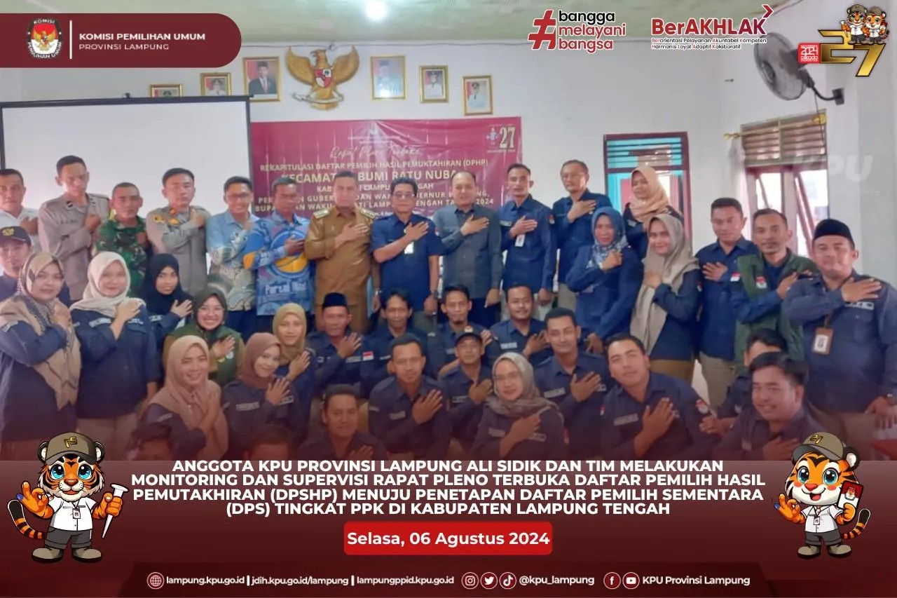 (Selasa, 06 Agustus 2024) Anggota KPU Provinsi Lampung Ali Sidik dan tim melakukan Monitoring dan Supervisi Rapat Pleno Terbuka Daftar Pemilih Hasil Pemutakhiran (DPSHP) Menuju Penetapan Daftar Pemilih Sementara (DPS) Tingkat PPK di Kecamatan Bumi Ratu Nuban Kabupaten Lampung Tengah.