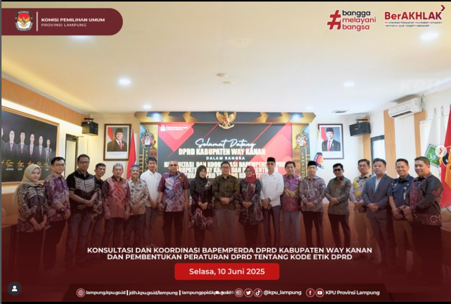 Dalam kegiatan ini, BAPEMPERDA DPRD Kabupaten Way Kanan menerima berbagai masukan dan pandangan dari KPU Provinsi Lampung terkait nilai-nilai etika politik dan tata kelola kelembagaan yang baik, sebagai dasar dalam penyusunan regulasi yang akan menjadi pedoman etis bagi anggota DPRD.