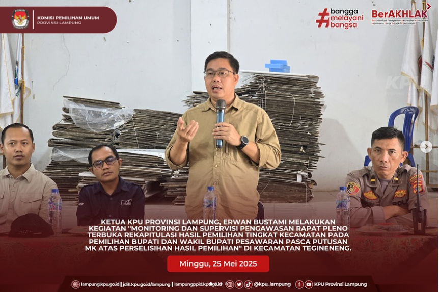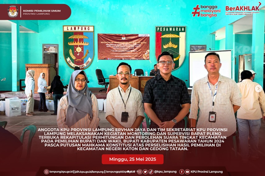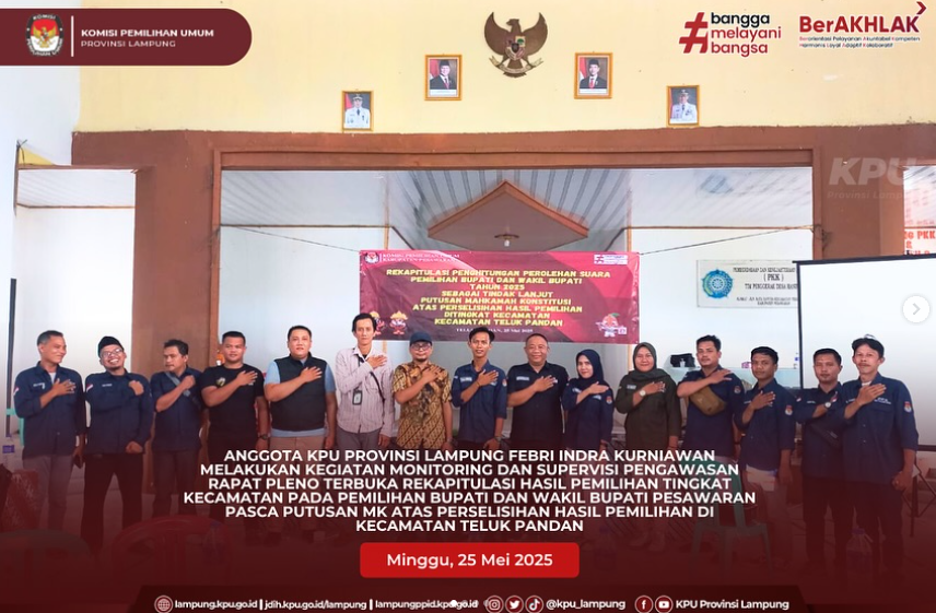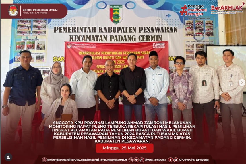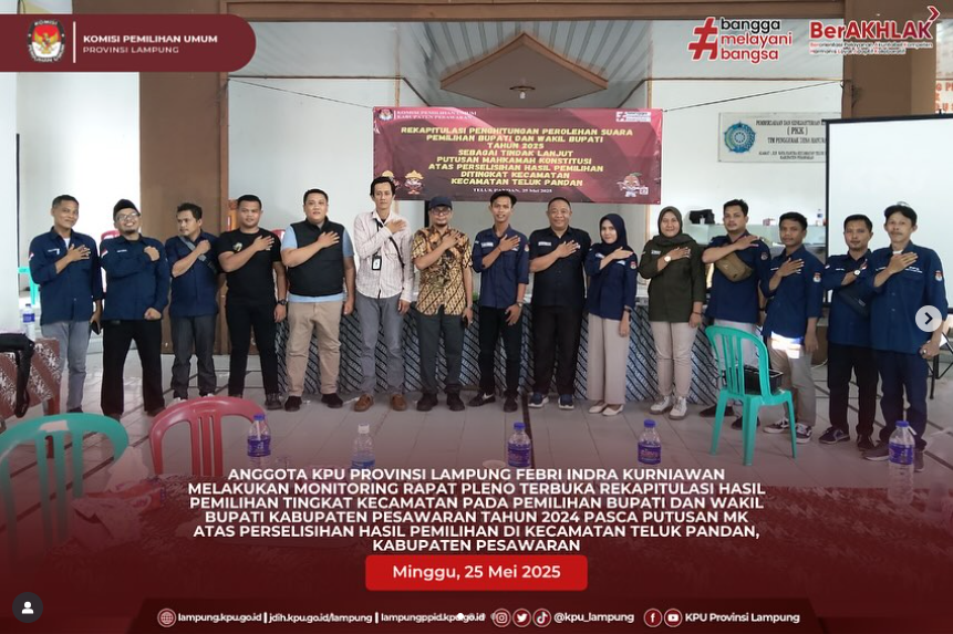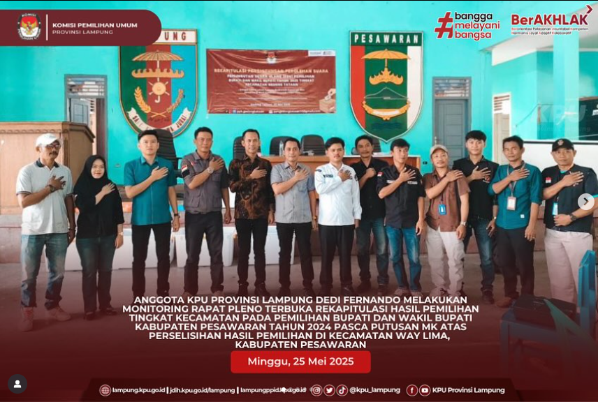Anggota KPU Provinsi Lampung Dedi Fernando didampingi Kasubag Parmas KPU Provinsi Lampung M.Ade Chandra, melakukan Monitoring Rapat Pleno Terbuka Rekapitulasi Hasil Pemilihan Tingkat Kecamatan pada Pemilihan Bupati dan Wakil Bupati Kabupaten Pesawaran Tahun 2024 Pasca Putusan MK Atas Perselisihan Hasil Pemilihan di Kecamatan Way Lima, Kabupaten Pesawaran.