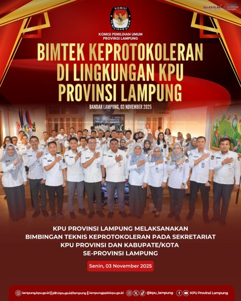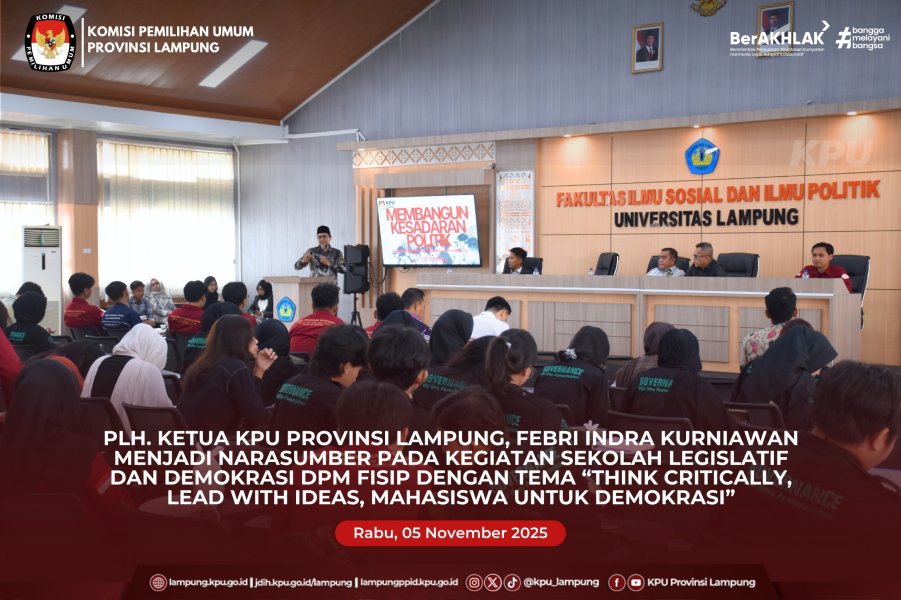 Plh. Ketua KPU Provinsi Lampung, Febri Indra Kurniawan hadir menjadi narasumber pada Kegiatan Sekolah Legislatif dan Demokrasi dengan Tema “Think Critically, Lead with Ideas, Mahasiswa untuk Demokrasi” yang di selenggarakan oleh DPM FISIP Universitas Lampung. Rabu, 5 November 2025 di Gedung B.3.1 FISIP Universitas Lampung, Bandar Lampung. Kegiatan diikuti oleh kurang lebih sebanyak 100 mahaiswa/i Universitas Lampung.