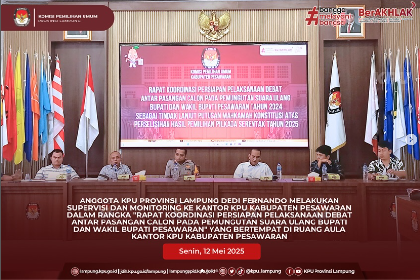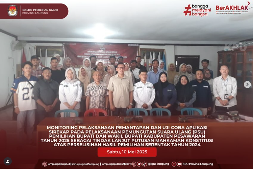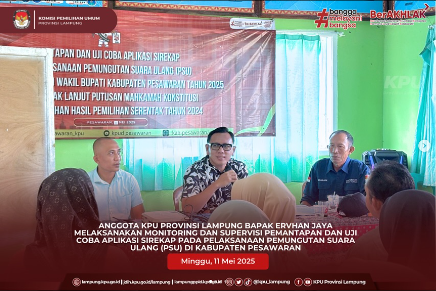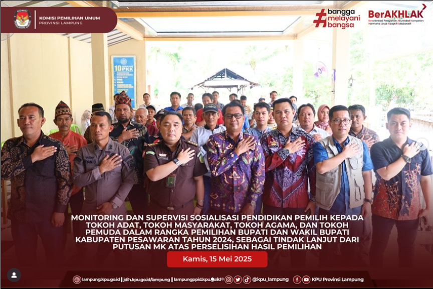 Anggota KPU Provinsi Lampung, Angga Lazuardy melaksanakan kegiatan monitoring dan supervisi sosialisasi pendidikan pemilih kepada tokoh adat, tokoh masyarakat, tokoh agama, dan tokoh pemuda dalam rangka Pemilihan Bupati dan Wakil Bupati Kabupaten Pesawaran Tahun 2024, sebagai tindak lanjut dari Putusan Mahkamah Konstitusi atas perselisihan hasil pemilihan.