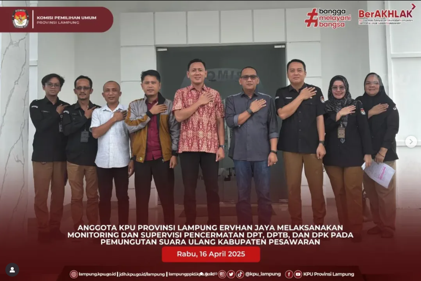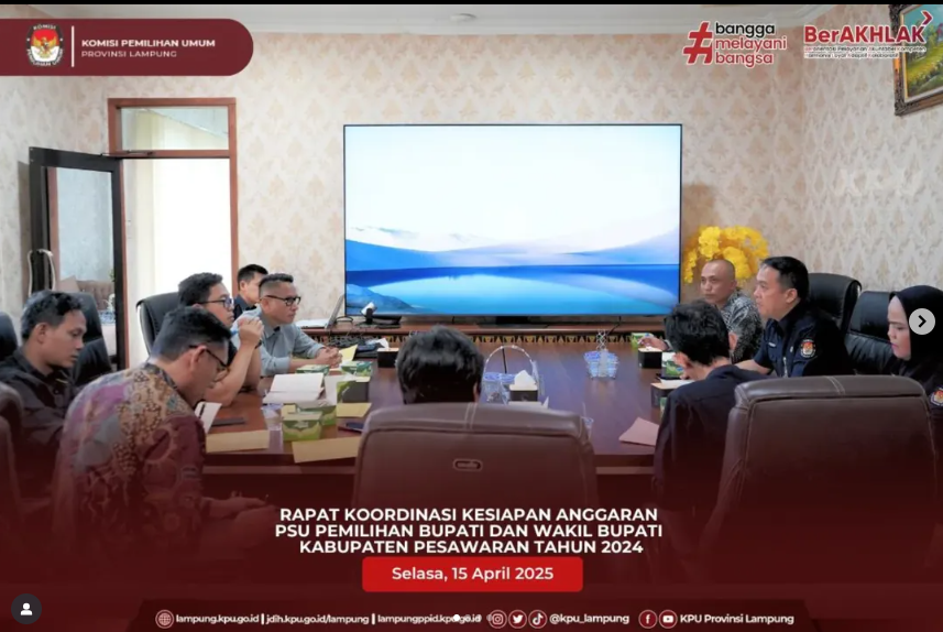 KPU Provinsi Lampung melaksanakan Rapat Koordinasi terkait Kesiapan Anggaran Pelaksanaan Pemungutan Suara Ulang (PSU) Pemilihan Bupati dan Wakil Bupati Kabupaten Pesawaran Tahun 2024 di Kantor KPU Provinsi Lampung.