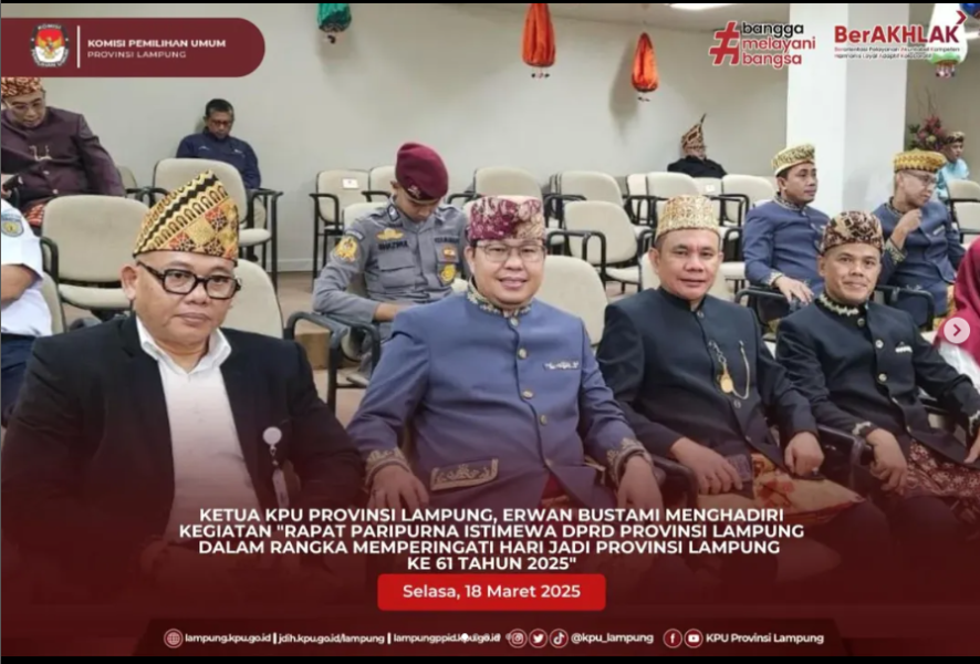 Dalam kegiatan ini turut hadir Ketua dan Anggota KPU Provinsi Lampung Erwan Bustami, Dedi Fernando, Ervhan Jaya, Angga Lazuardy, Febri Indra Kurniawan, Hermansyah, dan Ahmad Zamroni, serta Ketua dan Anggota Bawaslu Provinsi Lampung, Pj. Sekretaris Daerah Provinsi Lampung M. Firsada beserta jajaran Organisasi Perangkat Daerah Provinsi Lampung.