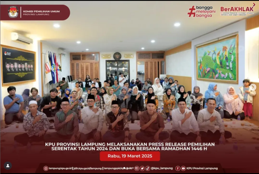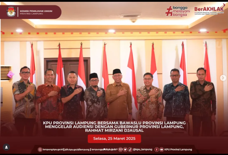 KPU Provinsi Lampung bersama Bawaslu Provinsi Lampung menggelar audiensi dengan Gubernur Provinsi Lampung, Rahmat Mirzani Djausal, di Ruang Rapat Sakai Sambayan, Kantor Pemerintah Provinsi Lampung.