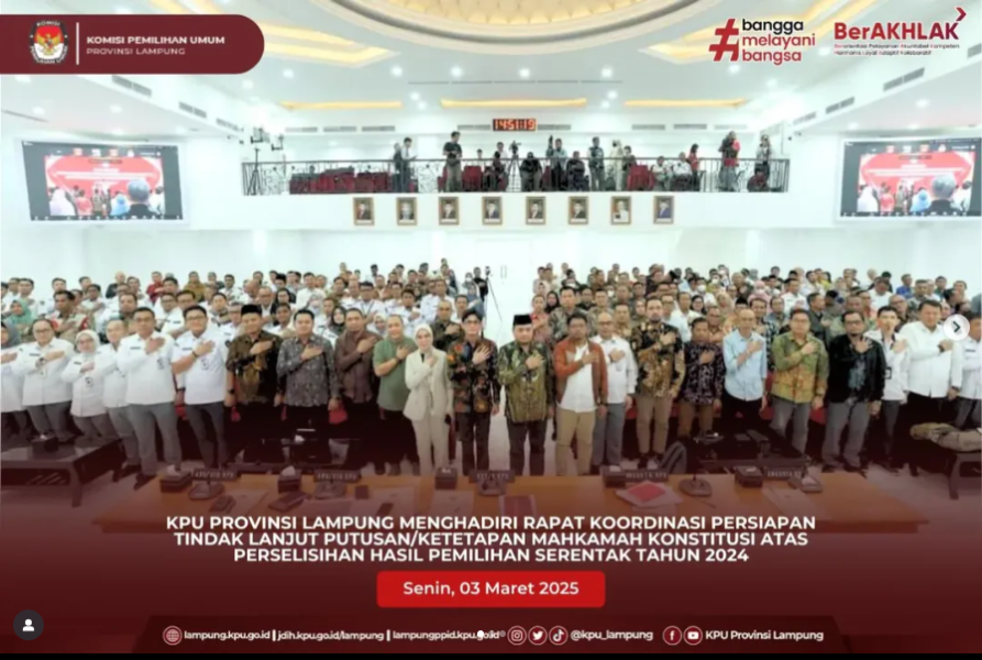 KPU Provinsi Lampung menghadiri Rapat Koordinasi Persiapan Tindak Lanjut Putusan/Ketetapan Mahkamah Konstitusi atas Perselisihan Hasil Pemilihan Serentak Tahun 2024, di Ruang Sidang Utama Lantai 2 KPU.