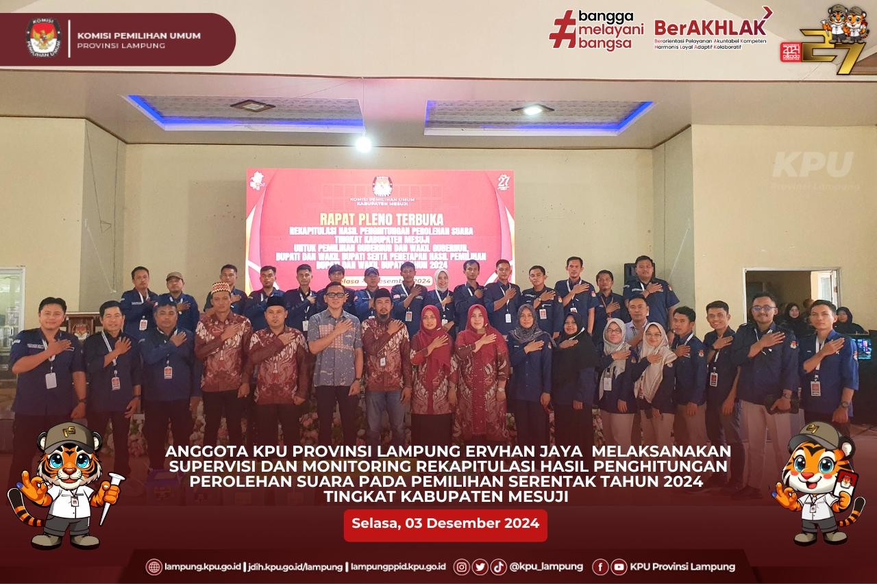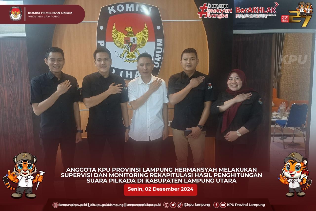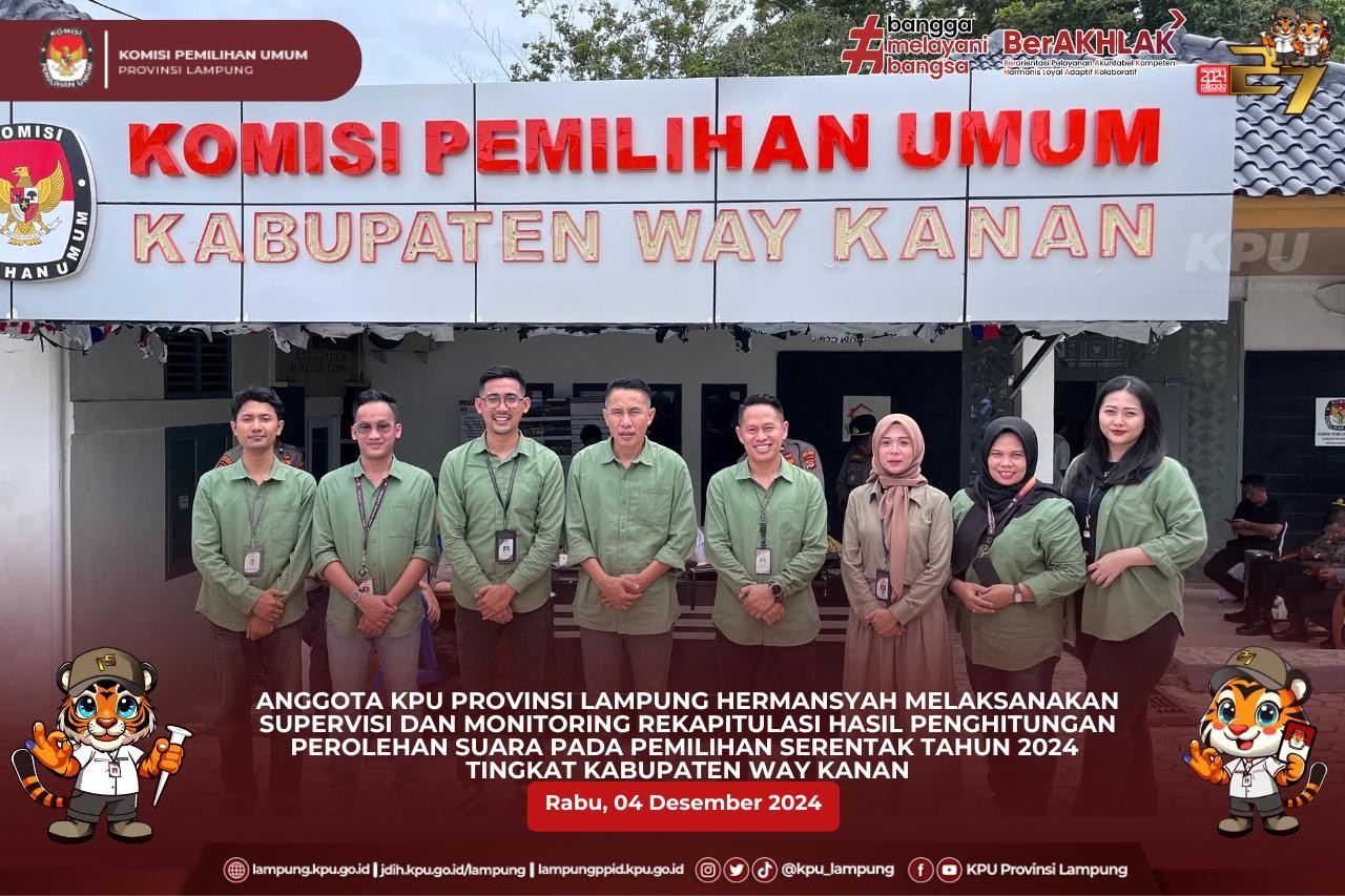 Anggota KPU Provinsi Lampung (Ketua Divisi Hukum dan Pengawasan), Hermansyah didampingi oleh Kepala Bagian Teknis Penyelenggaraan Pemilu, Partisipasi dan Hubungan Masyarakat, Yustian Umri Sangon, Kasubbag Hukum, Eltra Fesadilop dan Staf Hukum melaksanakan Supervisi dan Monitoring Rekapitulasi Hasil Penghitungan perolehan Suara Pilkada 2024 Tingkat KPU Kabupaten/Kota di Kabupaten Way Kanan.