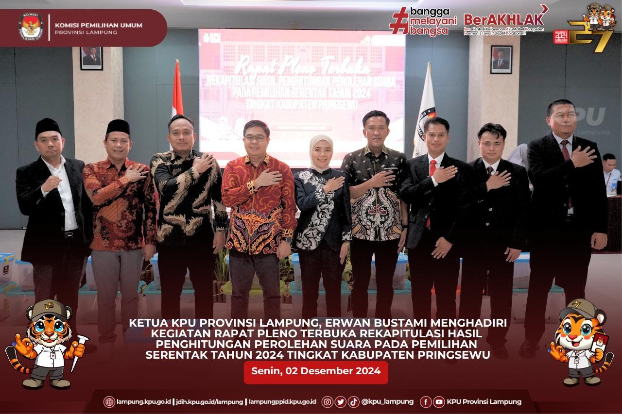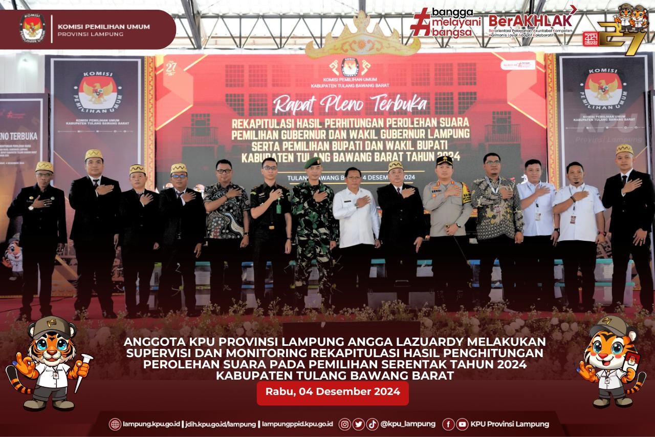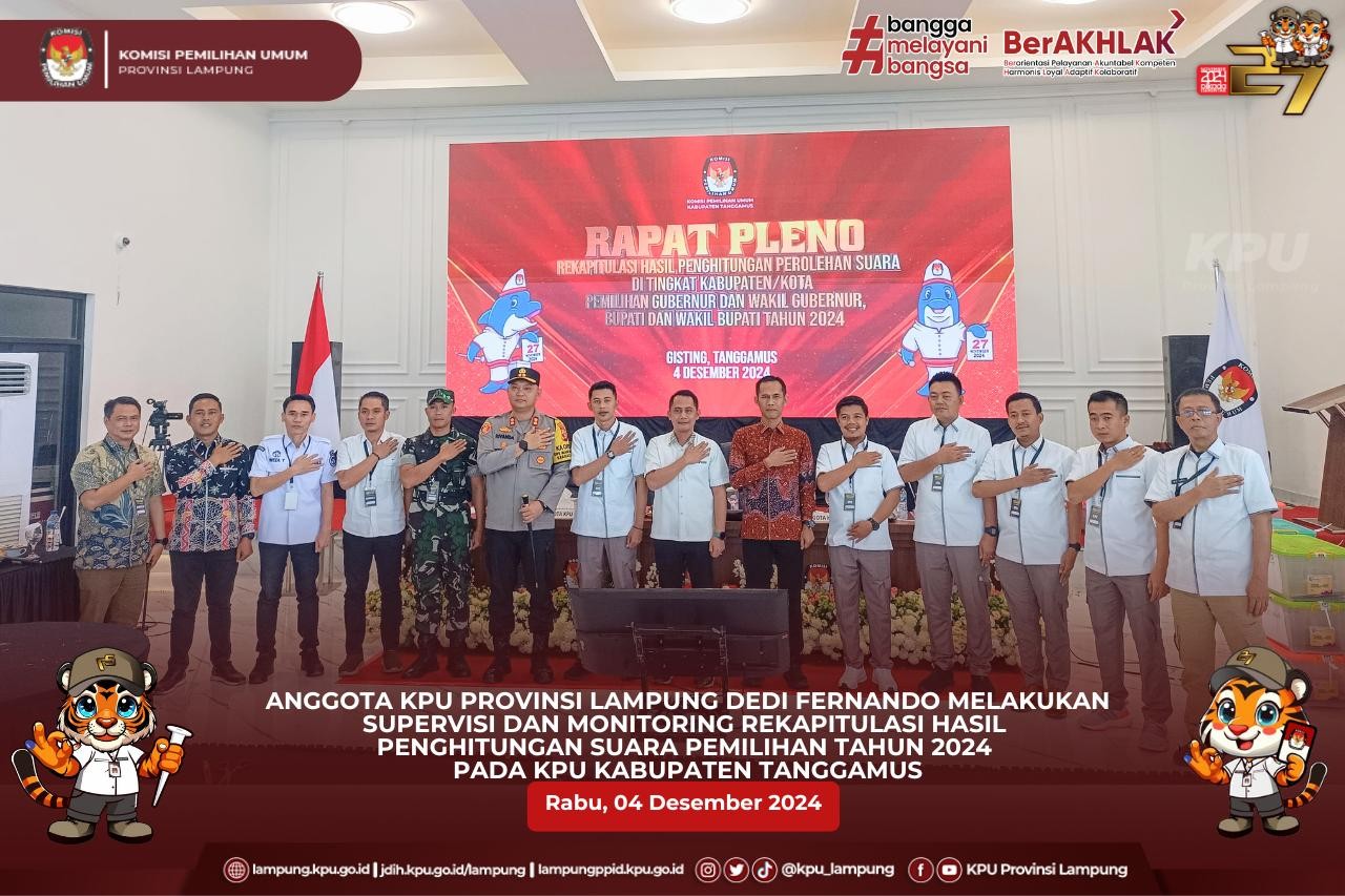 Anggota KPU Provinsi Lampung (Ketua Divisi Hukum dan Pengawasan), Hermansyah didampingi oleh Kepala Bagian Teknis Penyelenggaraan Pemilu, Partisipasi dan Hubungan Masyarakat, Yustian Umri Sangon, Kasubbag Hukum, Eltra Fesadilop dan Staf Hukum melaksanakan Supervisi dan Monitoring Rekapitulasi Hasil Penghitungan perolehan Suara Pilkada 2024 Tingkat KPU Kabupaten/Kota di Kabupaten Way Kanan.