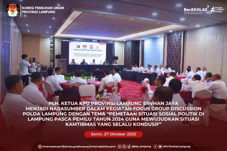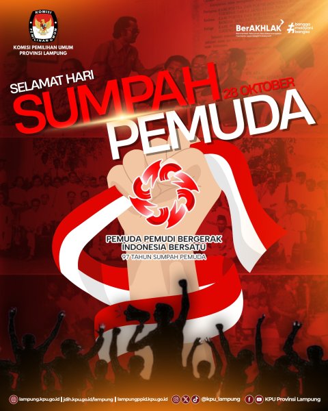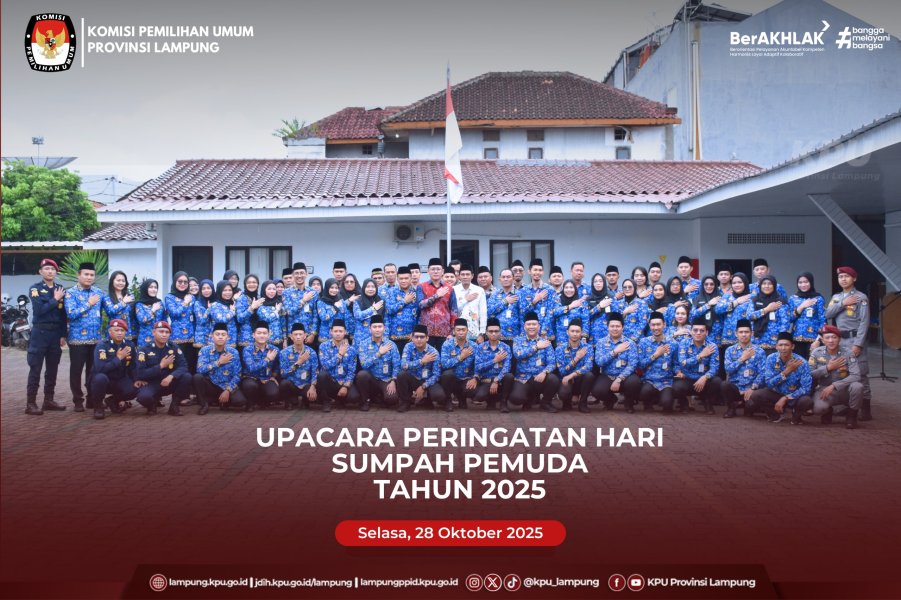 #TemanPemilih, KPU Provinsi Lampung melaksanakan Upacara Peringatan Hari Sumpah Pemuda Tahun 2025 di Halaman Kantor KPU Provinsi Lampung, Selasa (28/10/2025). Bertindak sebagai inspektur upacara Plh. Ketua KPU Provinsi Lampung, Ervhan Jaya. Turut Hadir mengikuti Upacara Anggota KPU Provinsi Lampung, Ahmad Zamroni, Jajaran Kabag, Jajaran Kasubbag dan staf KPU Provinsi Lampung. Pada Kesempatan tersebut Ervhan Jaya dalam amanatnya yang membacakan Pidato Ketua KPU Republik Indonesia Pada Upacara Peringatan Hari Sumpah Pemuda Ke-97 Tahun 2025 mengajak peserta Upacara untuk mengukukuhkan persatuan dan kesatuan Indonesia, dengan menghentikan segala bentuk perdebatan yang mengarah pada perpecahan bangsa. Ia juga mengingatkan kepada Peserta Upacara untuk selalu menjaga profesionalitas, integritas dan profesionalitas dalam menjalankan tugas di masa Non Tahapan Pemilu/Pilkada, serta mempersiapkan diri dalam menyongsong Pemilu 2029 mendatang, dengan Semangat Tema Sumpah Pemuda pada Tahun 2025 ini “Pemuda Pemudi Bergerak, Indonesia Bersatu”. Kegiatan Upacara berlangsung tertib dan khidmat. #KPUMelayani #KPULampung #InfoKPU
