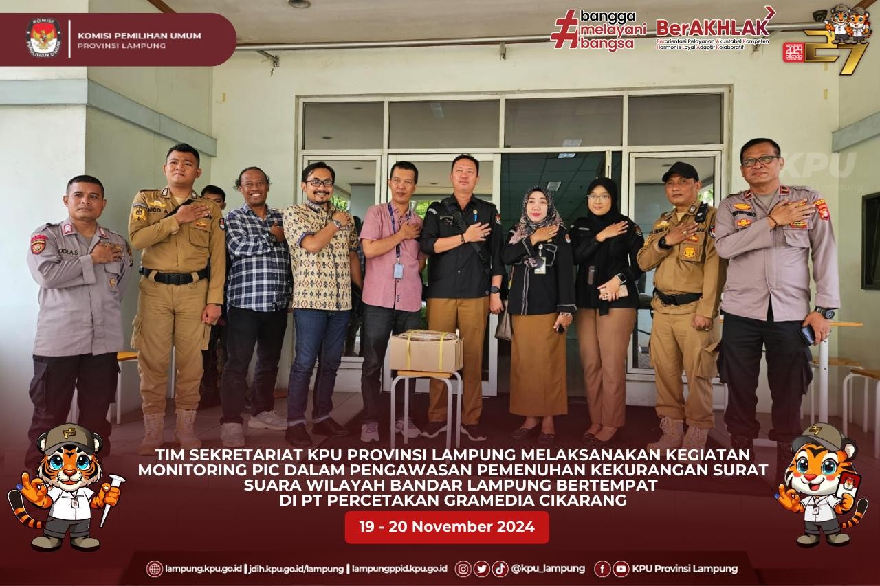 Tim Sekretariat KPU Provinsi Lampung yang dalam hal ini dilaksanakan oleh Apid Heri Herlambang selaku Pelaksana dan staf sekretariat KPU Provinsi Lampung melaksanakan kegiatan Monitoring PIC dalam Pengawasan Pemenuhan Kekurangan Surat Suara Wilayah Bandar Lampung bertempat di PT Percetakan Gramedia, Cikarang, Bekasi, Jawa Barat.