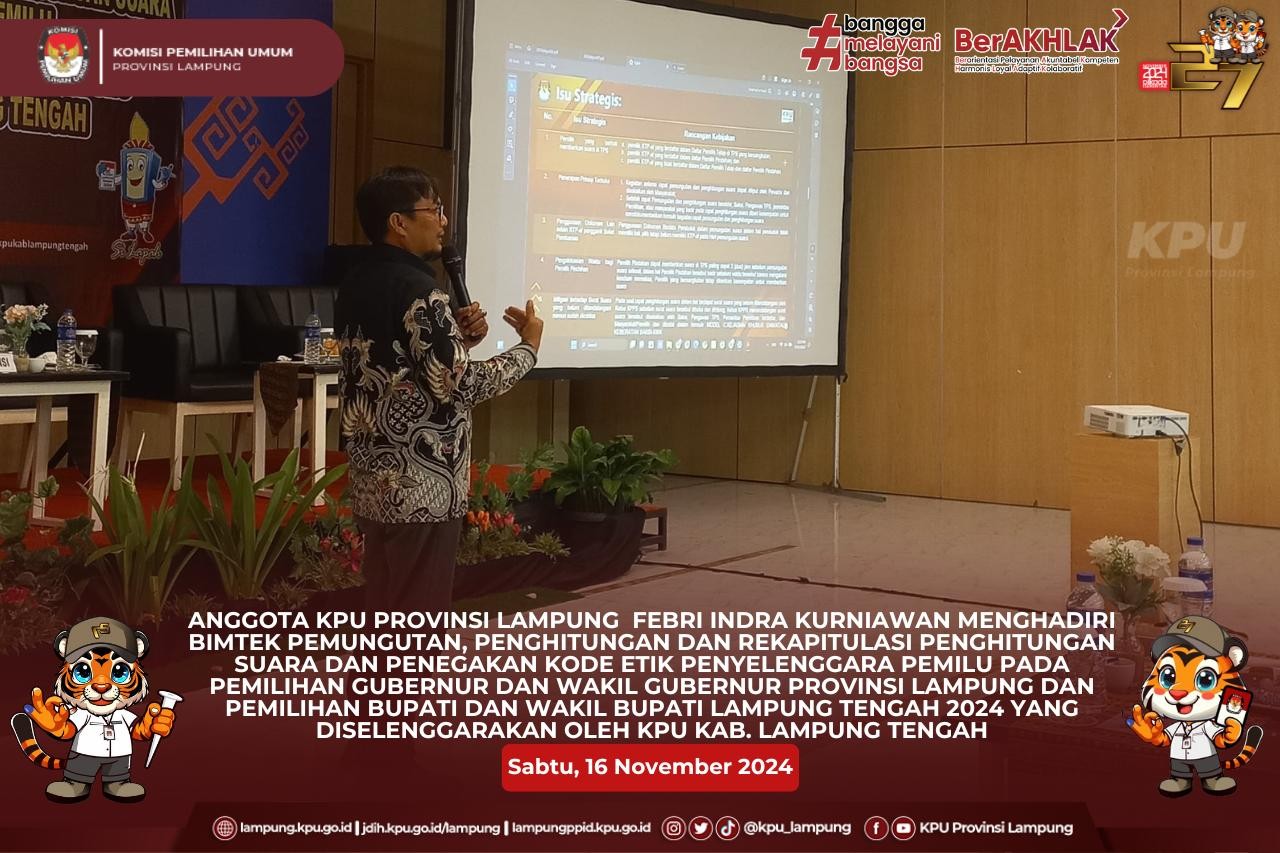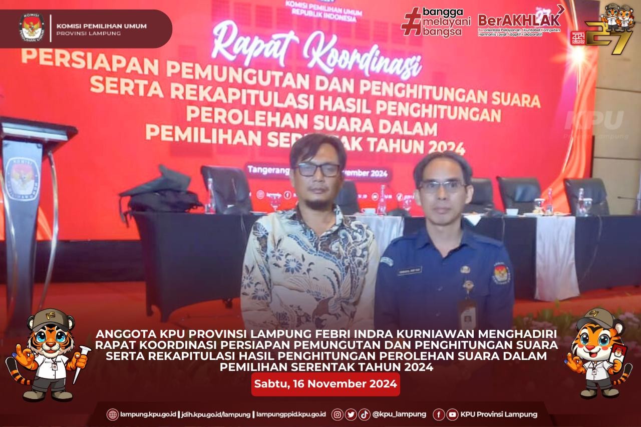 (Sabtu, 16 November 2024) Anggota KPU Provinsi Lampung (Ketua Divisi Teknis Penyelenggara) Febri Indra Kurniawan didampingi oleh Kasubbag Teknis KPU Provinsi Lampung Ismail As'ad Menghadiri Rapat Koordinasi Persiapan Pemungutan dan Penghitungan Suara Serta Rekapitulasi Hasil Penghitungan Perolehan Suara Dalam Pemilihan Serentak Tahun 2024 bertempat di Hotel Swissbell Serpong Tanggerang Selatan. Ketua KPU Mochammad Afifuddin, Anggota KPU Idham Holik, dan Iffa Rosita bersama Sekretaris Jenderal KPU Bernad Dermawan Sutrisno membuka dan memberikan arahan pada Rapat Koordinasi Persiapan Pemungutan dan Penghitungan Suara Serta Rekapitulasi Hasil Penghitungan Perolehan Suara Pilkada 2024. Dalam sambutan, Afif menyampaikan bahwa rapat ini untuk memastikan kesiapan teknis penghitungan dan rekapitulasi suara dalam Pilkada Serentak 2024. Rapat akan membahas isu-isu strategis seperti pengelolaan logistik, penanganan surat suara, dan formulir. Afif juga mengingatkan pentingnya berbagi tugas dan tanggung jawab, memaksimalkan energi untuk memastikan kelancaran pelaksanaan pilkada. Sementara itu, Iffa menekankan pilkada kali ini berbeda dari pilkada sebelumnya. Oleh karena itu, kepercayaan publik melalui komunikasi efektif, koordinasi yang kuat, dan kesiapan merespons berbagai situasi perlu ditingkatkan. Selanjutnya, Bernad menjelaskan fokus utama pertemuan adalah memastikan kesiapan seluruh divisi dan unit kerja dalam mendukung tahapan puncak pilkada, dengan penekanan pada koordinasi internal dan eksternal yang komprehensif. Koordinasi tidak hanya pada divisi teknis saja, melainkan antar divisi dan Unit kerja di Sekretariat. Bernad juga meminta meminta agar seluruh jajaran sekretariat memastikan dana operasional dan honor KPPS telah disiapkan dengan baik. Acara tersebut dihadiri oleh Ketua KPU RI Mochammad Afifuddin, Anggota KPU Idham Holik, dan Iffa Rosita bersama Sekretaris Jenderal KPU Bernad Dermawan Sutrisno, jajaran Pejabat Eselon I dan II Setjen KPU, Anggota KPU Provinsi/KIP Aceh yang membidangi Divisi Teknis Penyelenggara Pemilu, Kabag/Kasubag KPU Provinsi, dan Tenaga Ahli Komisi II DPR RI.