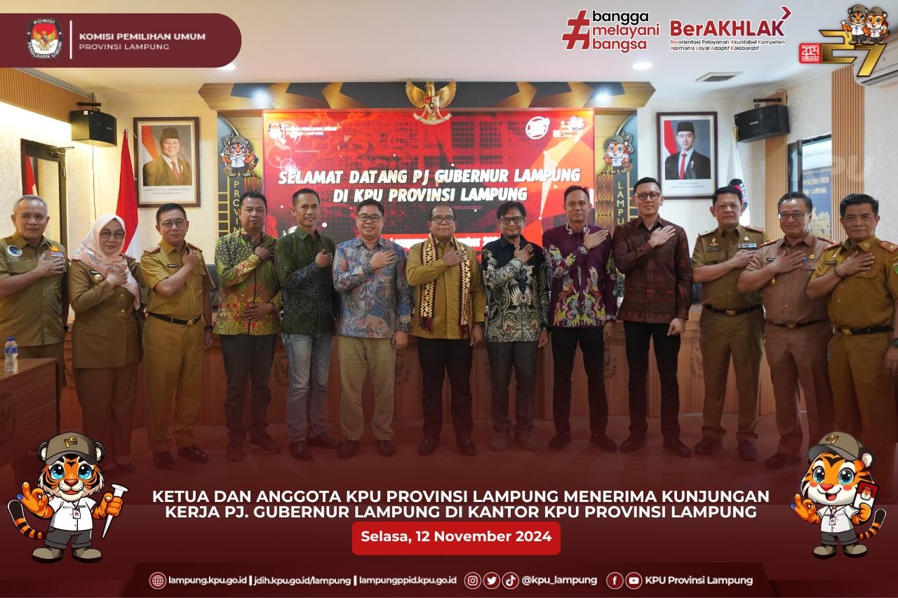 Ketua KPU Provinsi Lampung, Erwan Bustami dan Anggota KPU Provinsi Lampung, Febri Indra Kurniawan, Dedi Fernando, Angga Lazuardy, Ervhan Jaya, dan Ahmad Zamroni menerima kunjungan kerja Pj. Gubernur Lampung, Samsudin bertempat di kantor KPU Provinsi Lampung.